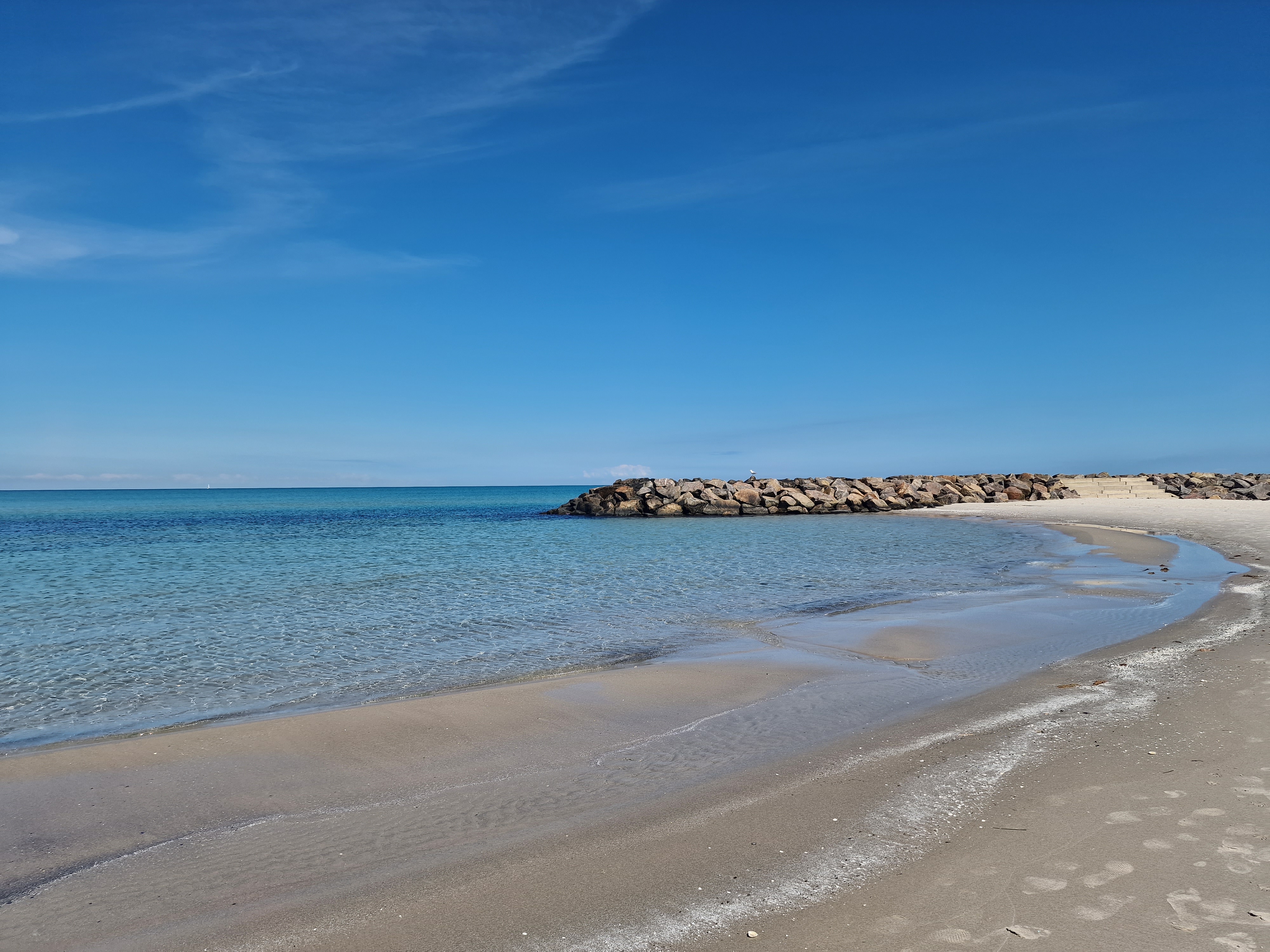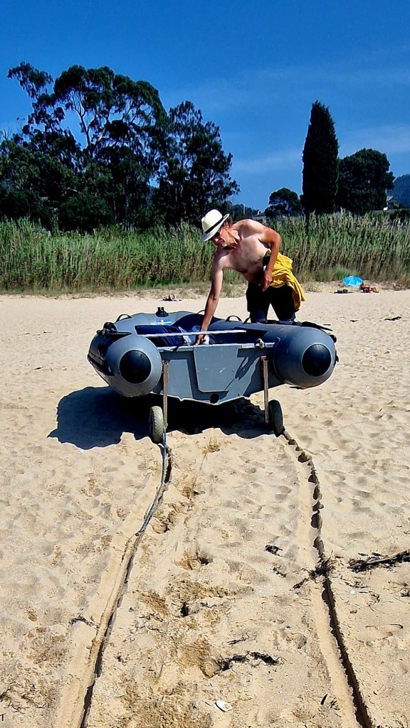 Nästa dag låg vi stilla med båten men rodde in till stranden. Där fixade vi hjul i aktern av jollen så den blir lättare att dra upp långt upp på stranden. Därefter gick vi hela stranden fram och tillbaka med fötterna i vattnet. Självklart plockade jag vackra snäckor längs promenaden. Något bad blev det däremot inte. 18 grader i vattnet funkar inte för en badkruka som jag