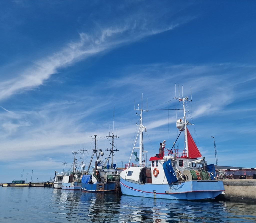 Vackra sanddynor mot blå kkarblå himmelHavet r helt kristallklartDanska fina fiskebåtar