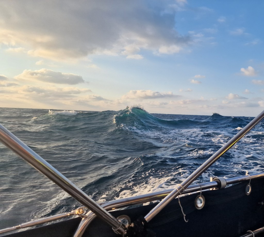 Ut på eftermiddagen tog vinden i ordentligt och vågorna växte till ca 4 meter höga. Detta höll i sig till fram på småtimmarna nästa morgon. Vi slumrade i omgångar då en av oss fick hålla vakt hela tiden. Det var väldigt skumpigt framme i förpiken och jag bullade upp med kuddar runtom mig för att rulla mot något mjukt.