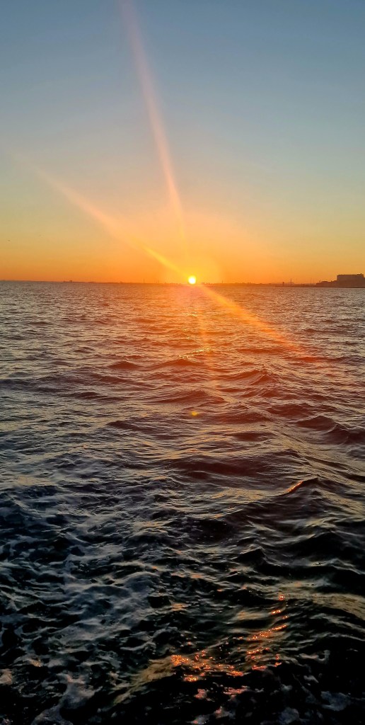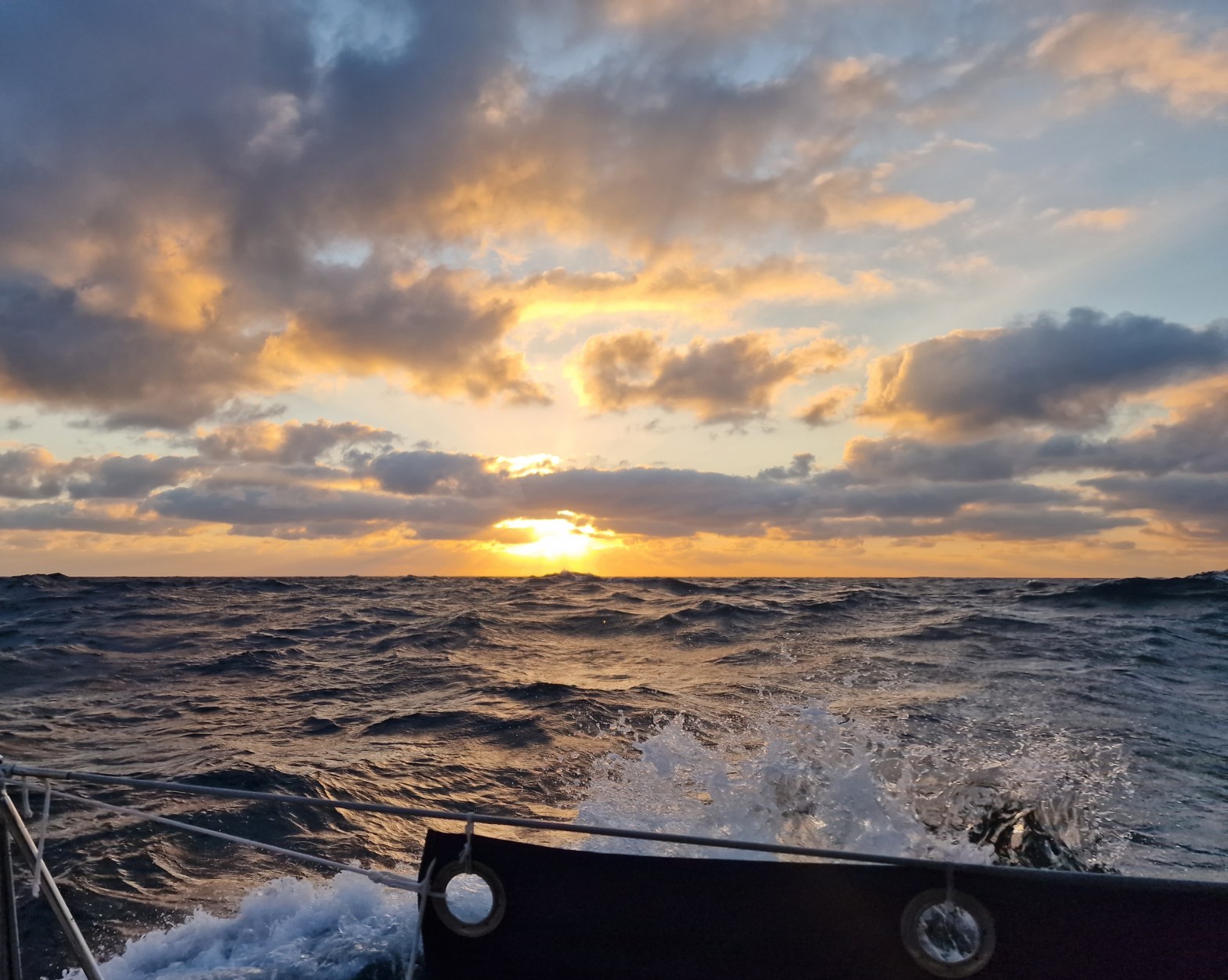 Natten gick mot tidig morgon och en fantastisk soluppgång. Då hade vinden avtagit men sjön var fortfarande grov i många timmar. Jan menar bestämt att han såg stora valar på långt avstånd. Jag såg åtminstone stora vattensprut upp ur havet så det kan mycket väl ha varit så.
