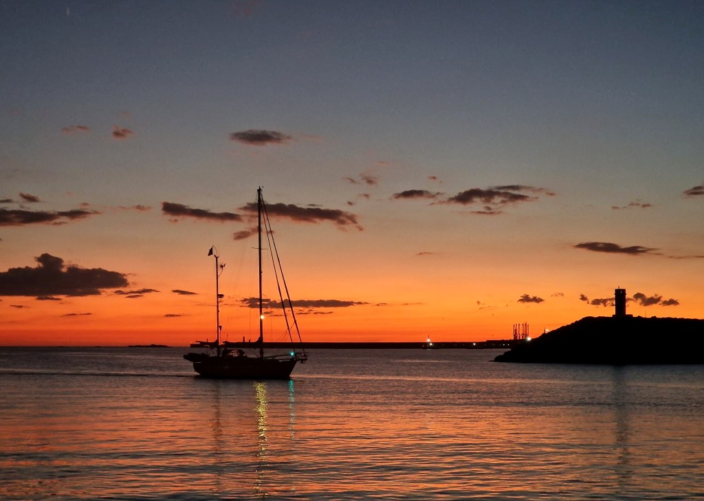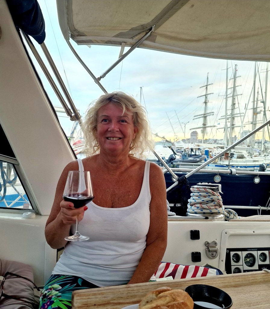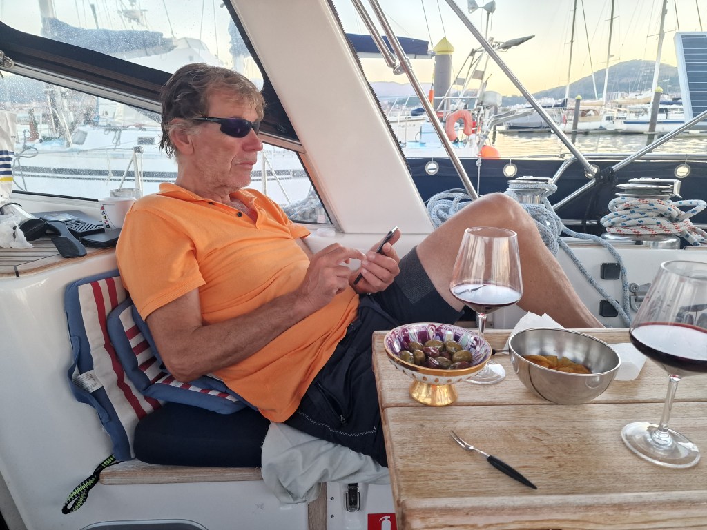 Det tog oss hela dagen tills vi anlände en hamn utanför Bilbao. Det var 2 mycket trötta sailors som kom iland och tog en helt underbar dusch. Sedan njöt vi av jättegott rött vin från Bordeaux med snacks till, i sittbrunnen med solnedgång bakom master i aktern. Det blev tidig sänggång och många timmars sömn innan vi vaknade idag till nya äventyr här i Spanien