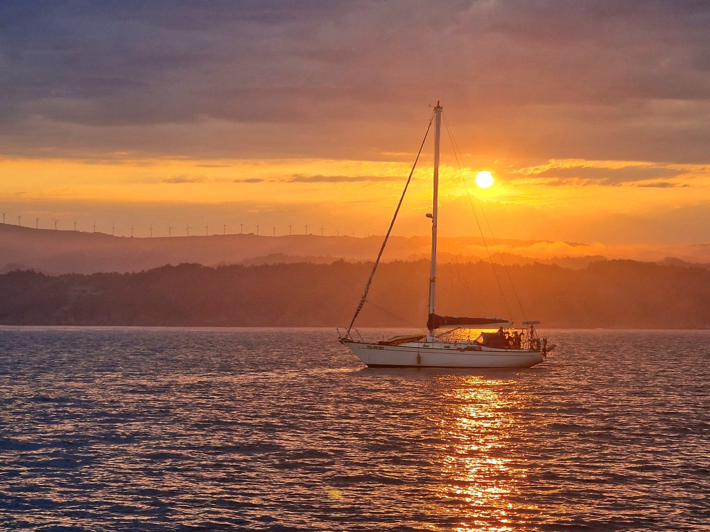 Flera båtar hade lagt till för natten när vi kom till CiesSolnedgång bakom ön Cies utanför Vigo i GalicienFredag morgon låg dimman tät in över land. Men den lättade sedan och det blev en härlig o solig dag