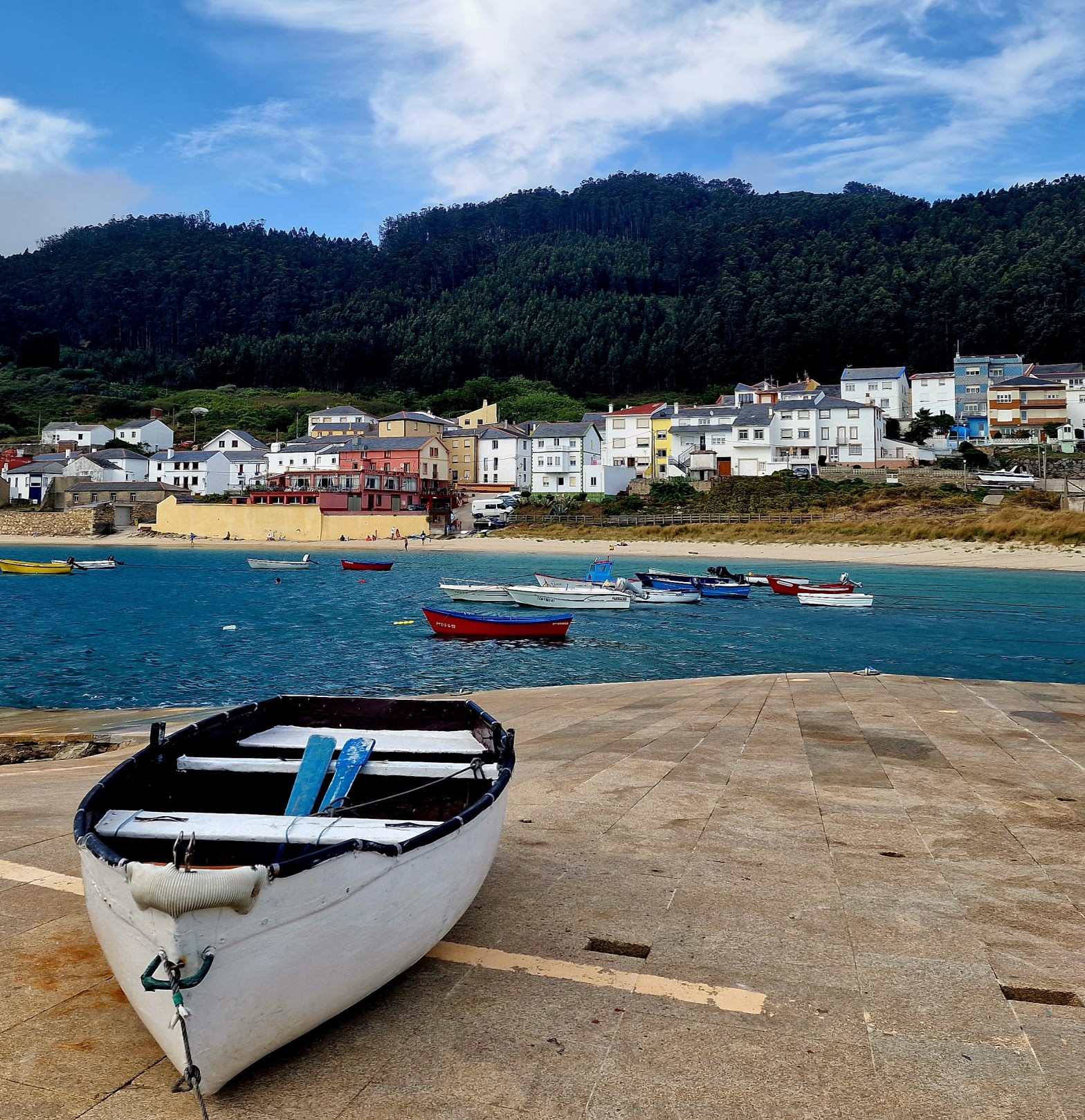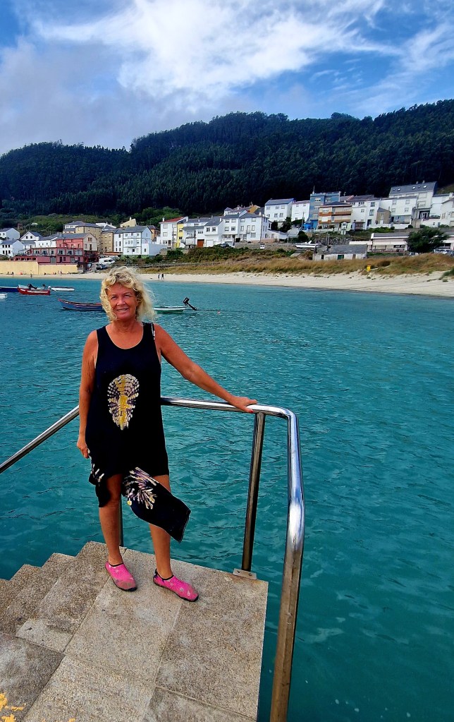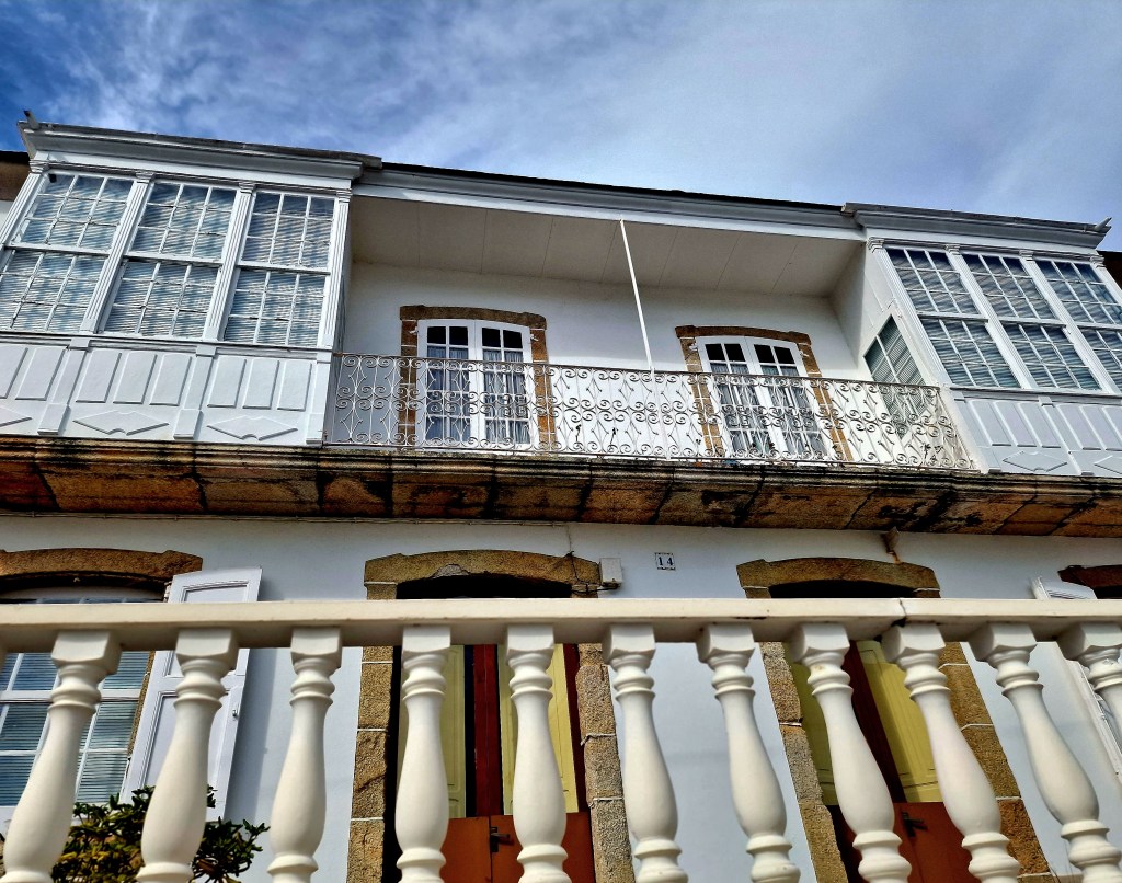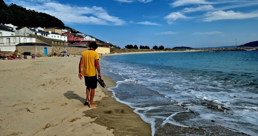 Strandpromenad med tofflorna i handen igenSpaniens nordligaste by I bakgrundenDen lilla byn Porto de BaresAlla dessa charmiga dörrarNågon som ansträngt sig för att göra det fint på trappanHär ligger Vilja tryggt på svaj