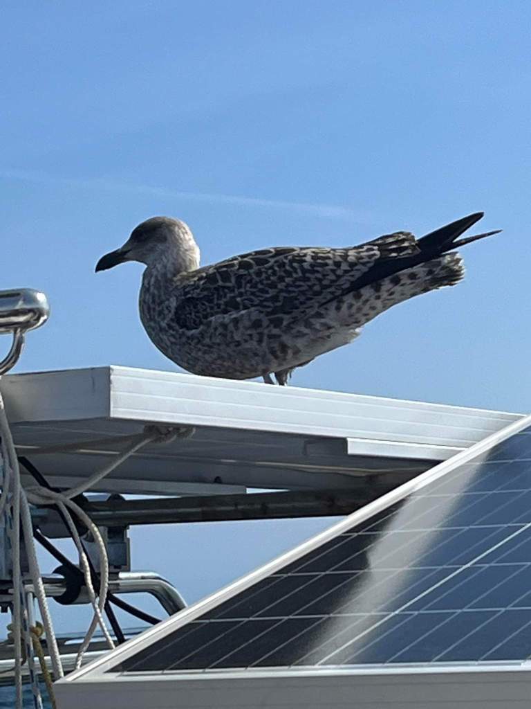 Solen skiner på akterdäckVi hade en fripassagerare en lång bit av resan. Antingen var han sällskapssjuk eller så ville han varken flyga eller simma
