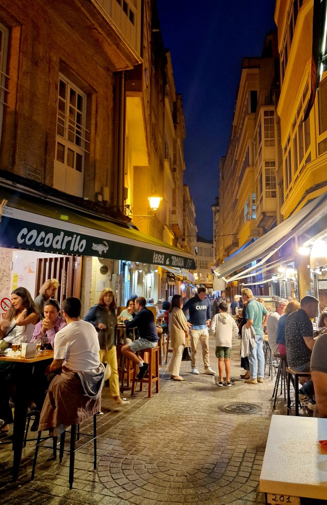 Restauranger o barer i trånga gränder och stort folkmyller till långt ut på nattenHelt färsk o supergod Kalamares frites med gott att dricka till