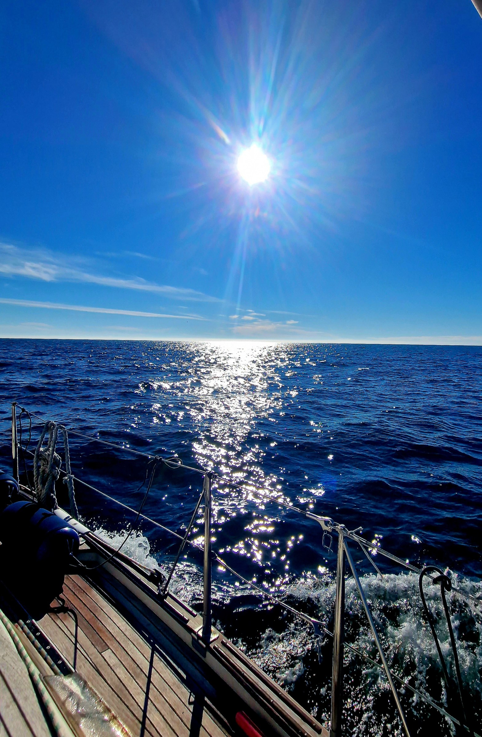 Morgonen började med perfekt slör i ca 6-7 knop. Sjön var ganska grov men Vilja surfade fint på vågorna. Vi fick besök av en flock delfiner som lekte runt båten en kortare stund. Men de simmade raskt vidare.