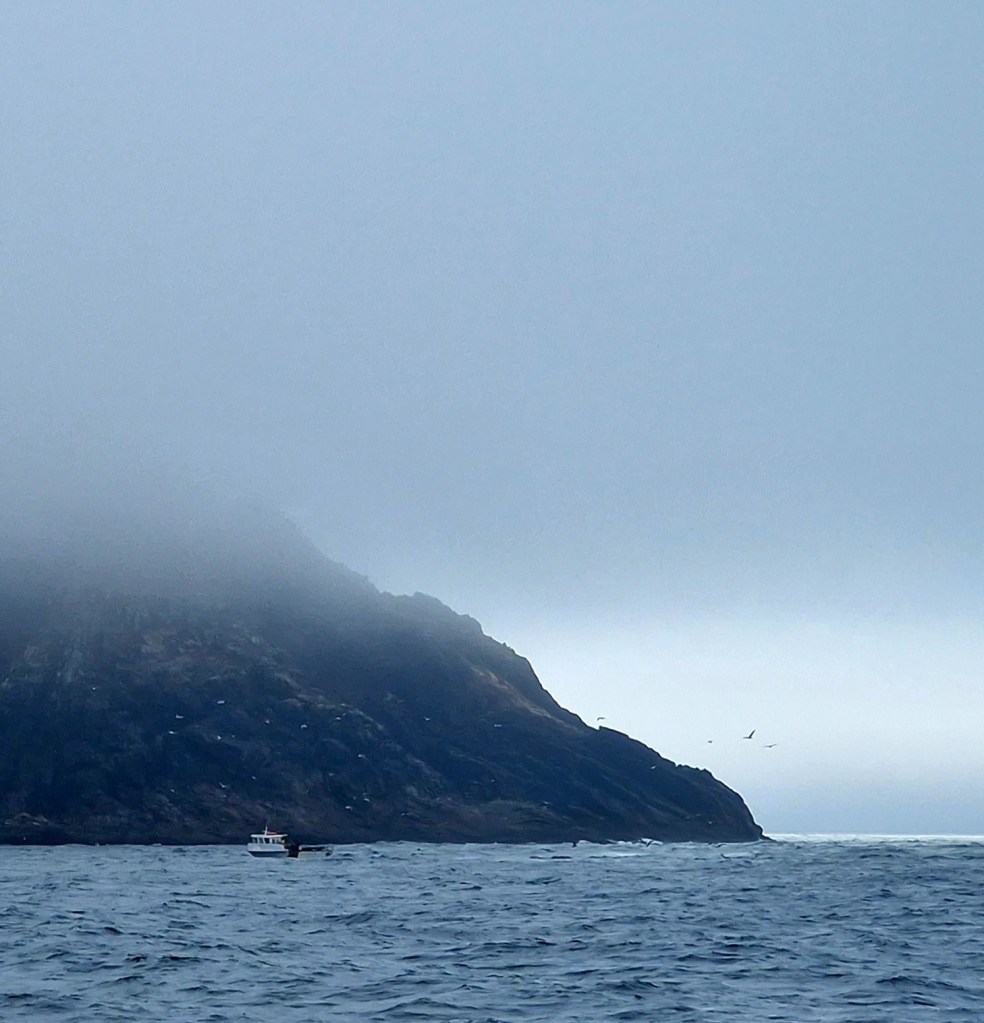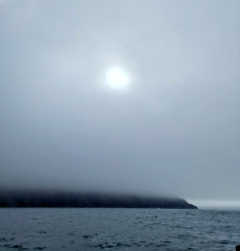 Idag gick vi upp när det fortfarande var mörk och vi lämnade så fort det började ljusna. Vädret har varit riktigt tråkigt med regn, låga moln o tidvis dålig sikt. Så idag blev det dubbla tröjor o byxor plus seglarställ