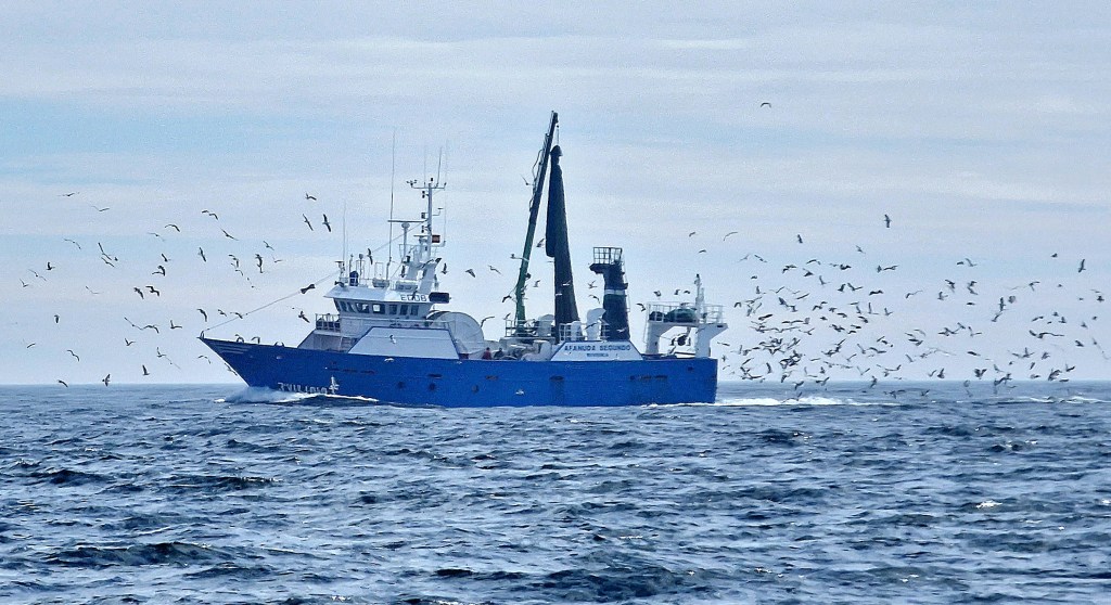 Vågorna skummar runt förenFåglarna flockas runt en av Spaniens alla fiskebåtarSnart framme, solen skiner och Jan njuter av tillvaron