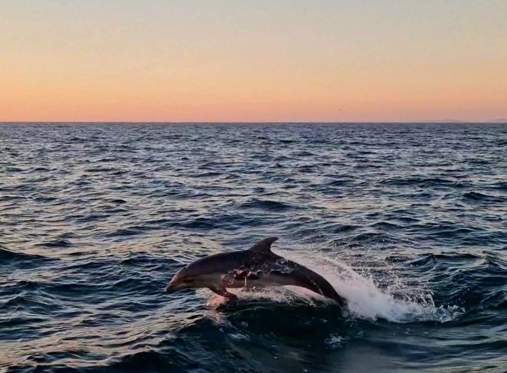 När vi närmade oss Sines i solnedgången dök ett stort stim av jättestora delfiner upp. De följde oss en stund hoppandes runt båten