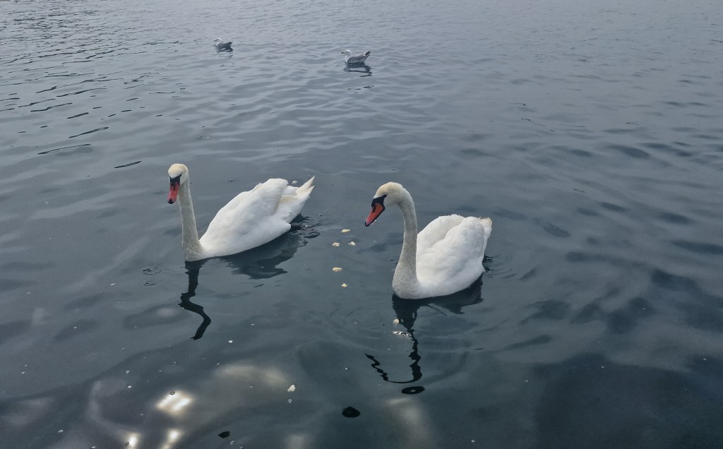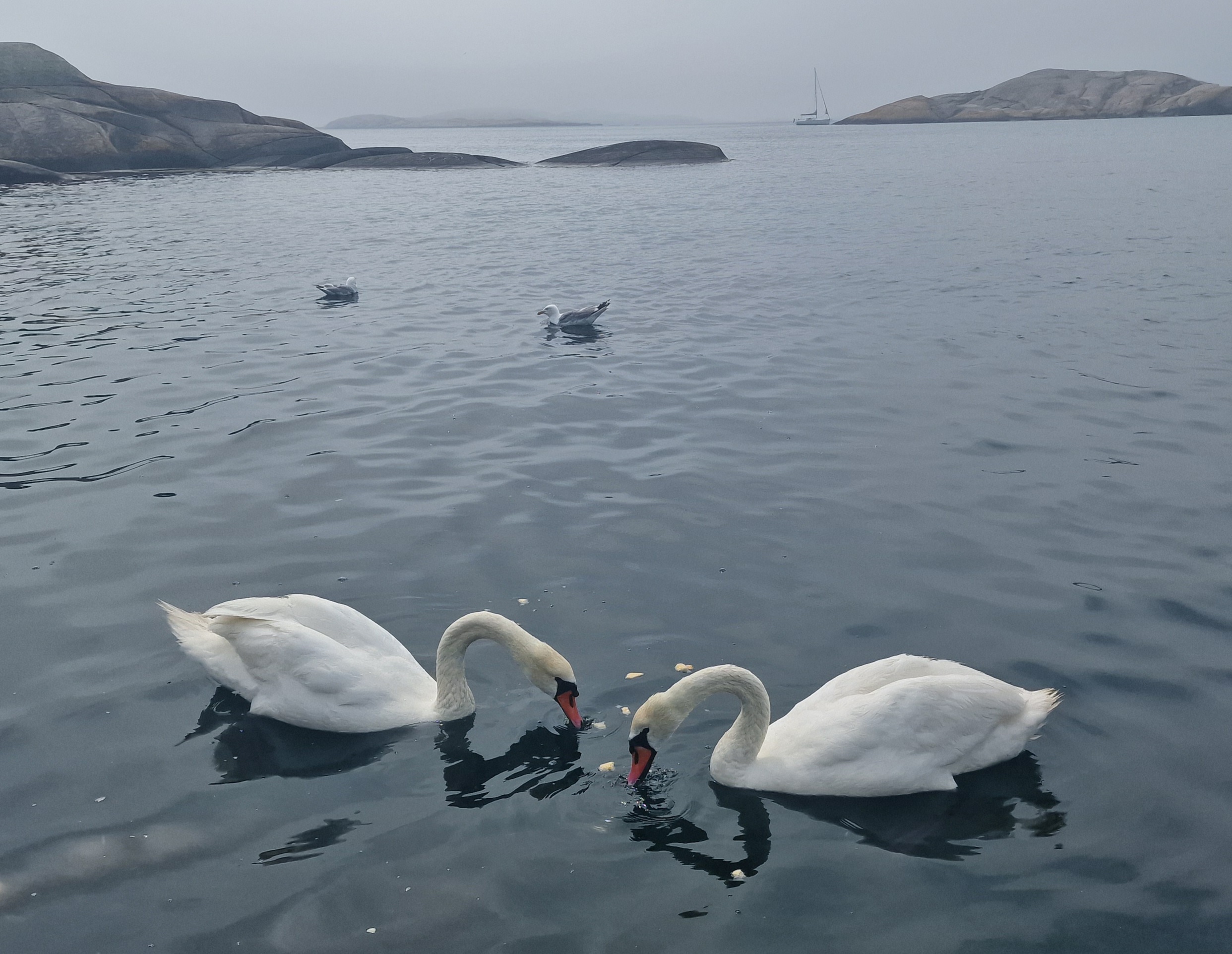 Jag hade turen att få finbesök av ett vackert svanpar. De lät sig bli bjudna på bröd jag kastade ut till dem. Trutar och måsar fick snällt vänta i bakgrunden och låta sig nöjas av de smulor svanarna inte åt upp