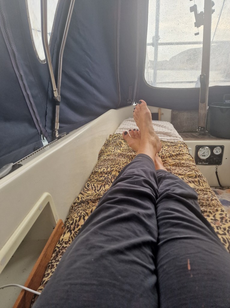 Igår, lördag, bytte jag naturhamn då det skulle komma starkare vindar från fel vindriktning. Så hittade en ny plats fär jag ligger tryggt. Vädret har varit ganska blåsigt och idag har det regnat en del så det blir mest slappande i sittbrunnen. Ljudböcker plöjer jag igenom och självklart lite mer pluggande av förarintyget