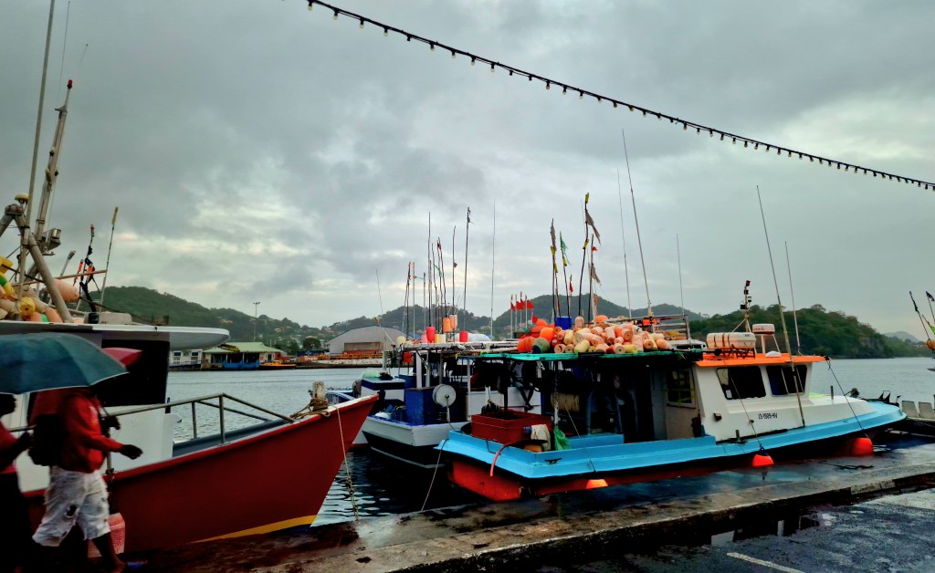 We arrive at Hanatefau Bay, which is closest to this incredibly beautiful view. Here we drop anchor and take the dinghy to the dinghy jetty. There we get good help from a local fisherman and that help is gratefully received as the sea swell is high and it is not easy to get in. Down at the water’s edge, the village children play and swim in the high waves that come in. They are not afraid. I would never have dared to swim there. We walk up through the small village which is surrounded by greenery and beautifully flowering bushes and trees. The smell of Gardenia hits us wherever we go. Straight ahead of us, the ”Pitones” tower majestically. It is strikingly beautiful. A little further inland we come to the fisherman’s house and we decide to buy fresh fish for dinner. Pink fish with enormous eyes. They live deep down in the sea according to the fisherman. The grilled fish will be sooo good!