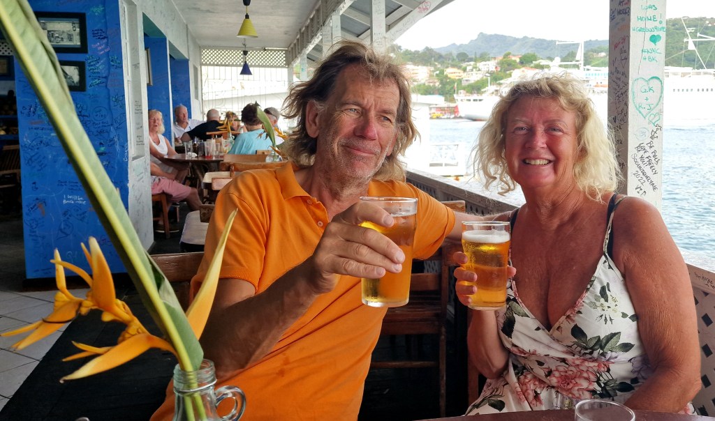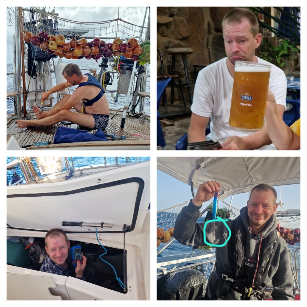 It’s Jan’s birthday today too and Marie has baked a cheesecake. At afternoon coffee there will be singing and cake with candles, much to Jan’s delight. Almost the entire cake is gone in one bite. In the evening we go ashore to eat at the pizzeria. What a luxury not to have to cook the food on board and that the plate, glass and cutlery are still on the table without being thrown around from one side to the other so that we have to be prepared to catch things all the time. I think we would have been experts at the Robinson elimination competition where they have to catch a pole that suddenly becomes illuminated. Our reaction skills are at their peak now.