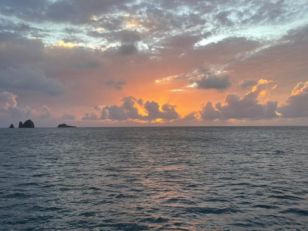 Redan när vi närmar oss viken vi skall in och lägga ankaret i möts vi av en stark blomdoft. Det är gryning med en otrolig soluppgång i fantastiska färger. De höga gröntäckta bergen skymtar dramatiskt fram allt eftersom ljuset tilltar. De stupar rakt ner i det djupa havet medan de dimhöljda topparna tronar majestätiskt upp sig mot skyn