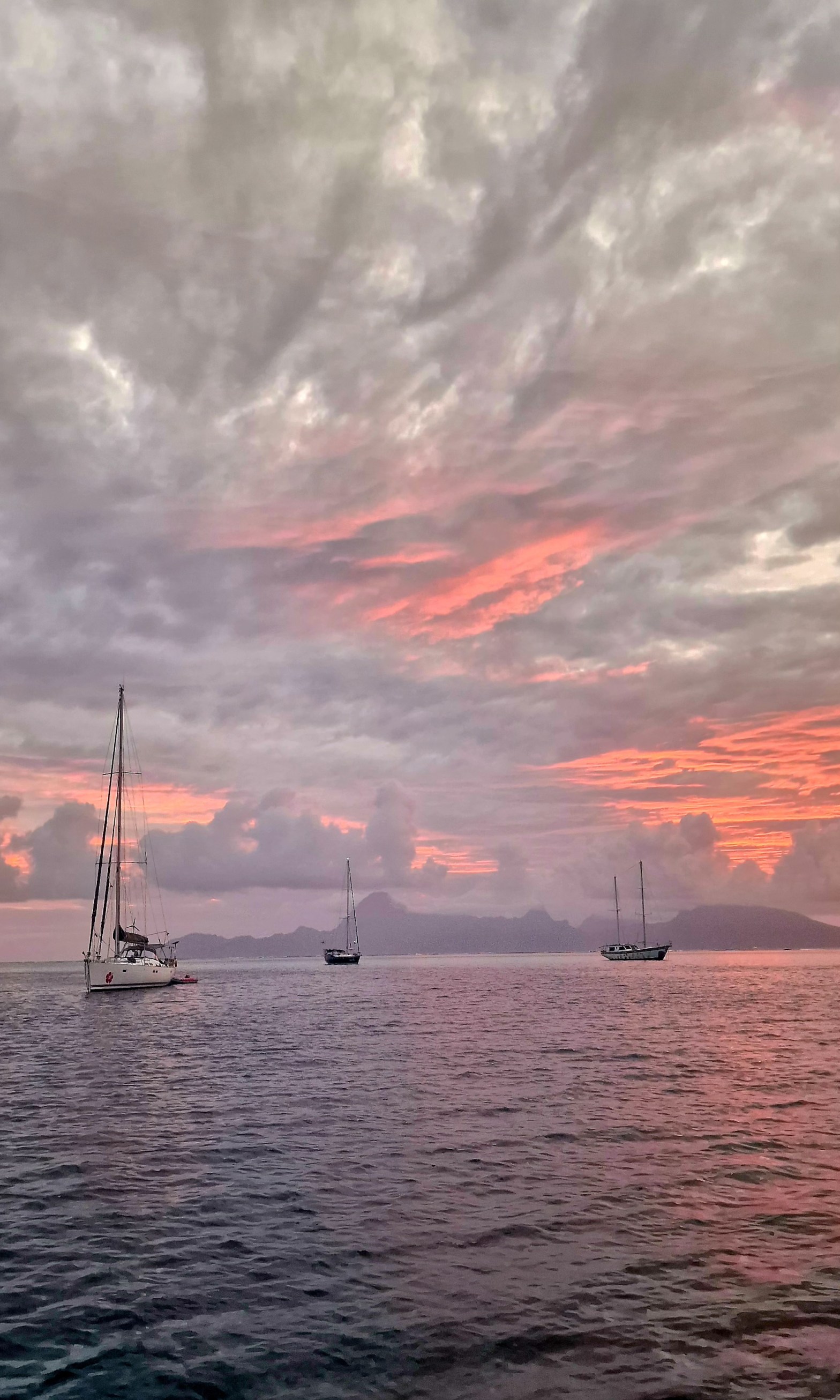 Vi rullar, vi rullar, vi rullar, vi rullar 🎼🎼🎼. Japp så är det. Vinden har nästan tagit slut så motorn är startad. Men rullar gör vi självklart oavsett. Just nu går vi nästan rakt mot solnedgången. Det är ju bara sååå vackert. Öppet hav runt oss. Vi är, som sagt, på väg mot Maupiha’a som också tillhör Franska Polynesien. Egentligen får vi inte lov att gå dit eftersom vi är utstämplade. Men i stort sett alla gör det. Där skall vi vänta ut de svaga vindar som kommer vara i några dagar nu. Sedan blir det äventyr! Vi kommer komma fram imorgon runt lunch. Både Aura o Magic är på väg mot sama mål. Bakom oss har vi ytterligare 2-3 båtar som lämnar Franska Polynesien i detta väderfönstret