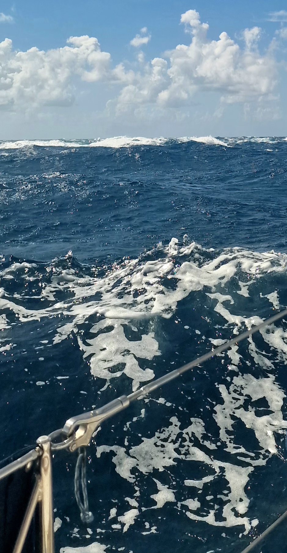 Det är svårt att få seglen att bli nöjda idag. Vinden är ganska svag och vågorna gör att vi rullar mycket. Vi provar att spira genuan, vilket betyder att man tvingar ut genuan på motsatt sida med en extra bom, men det fungerar inte. Det behövs två uppe på däck för att få till det. Vinden är rakt akterifrån så det är plattläns. Vilket betyder att genuan inte får så mycket vind utan storseglet tar den lilla vind som är. Eftersom vi rullar så mycket vrider vinden ibland in lite från styrbord och ibland lite från babord så seglen slår obehagligt och det sliter på dem.