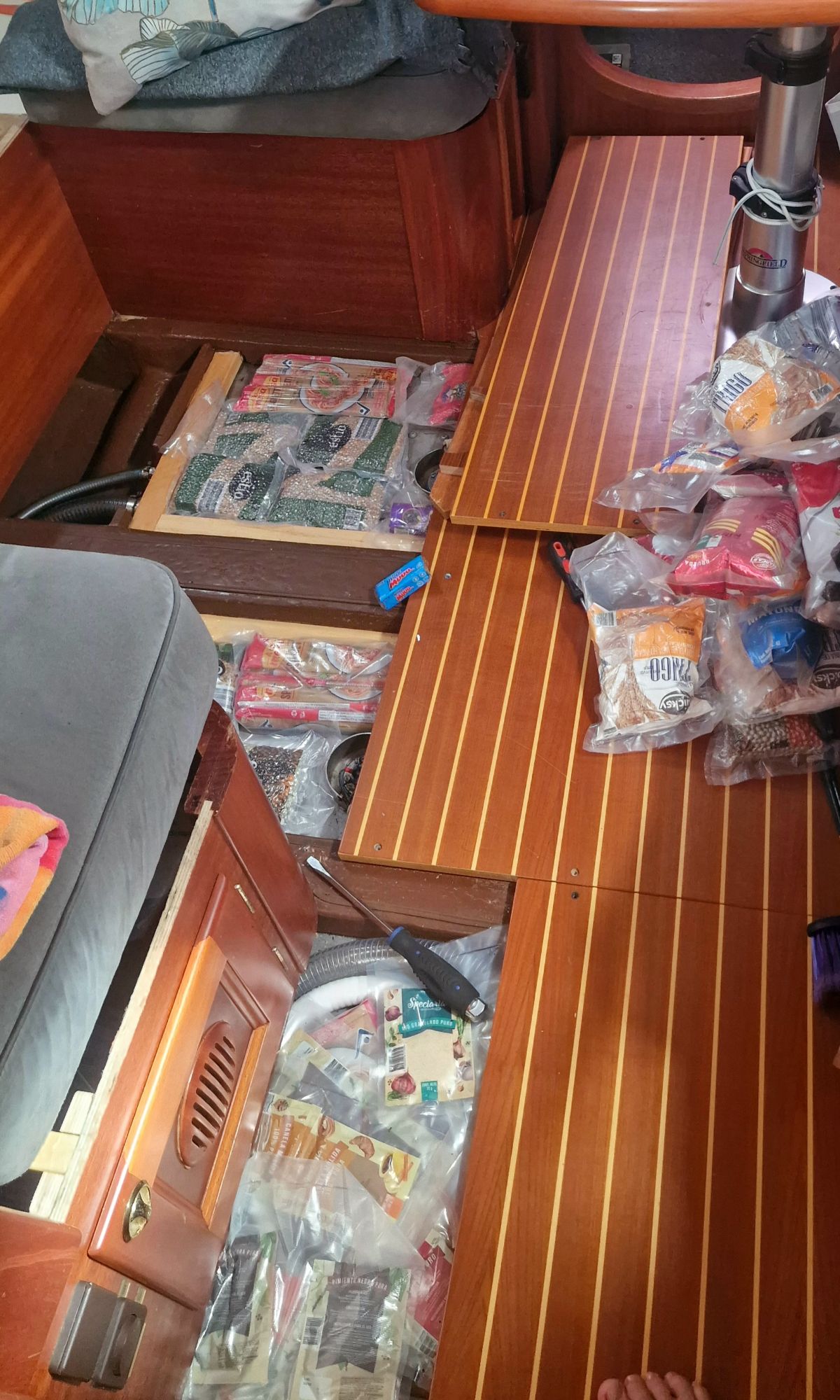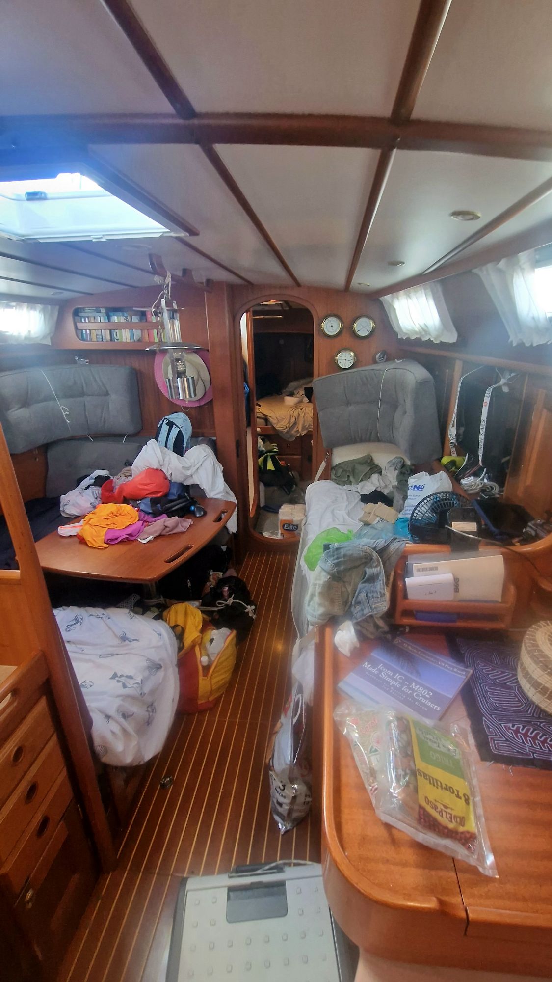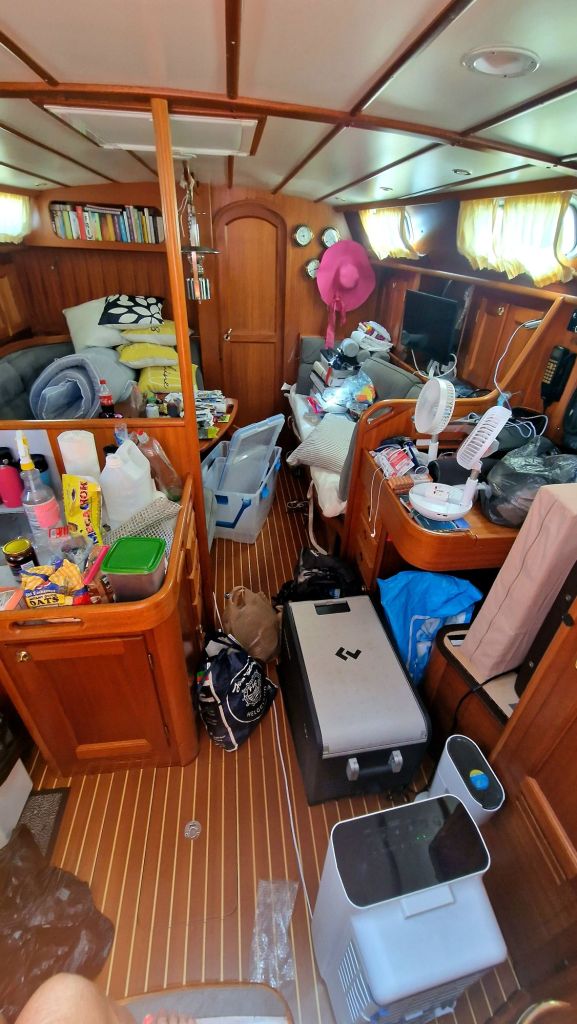 Then comes the bureaucracy…first about 15 pages of paper to fill out. Then a review of all the food we have on board. In all the cupboards. And the woman who is with me is not merciful. We have provisions to sail to Tuvalu and have the freezer full of meat and fish. And the fridge full of dairy products. We also have vegetables in abundance. Especially onions and garlic. Usually have a lot of it. The woman who is with me takes everything…absolutely all meat. Even canned meat. She speaks with real disgust about pork like bacon and salami. Which poisons Fiji, according to her. Food worth probably 2000 kronor, and which we will not be able to get here, just disappears and is thrown away. Also all the vegetables. Luckily, we get to keep all the dairy anyway. I empty one cupboard after another in her sight and she chooses what we get to keep. Some lockers are sealed and we are allowed to keep them but not open them while we are here in Fiji, but most of it is taken away, confiscated. We can keep the alcohol but most of it will be sealed. Oh, that’s no big problem. We won’t be here long and we can do without alcohol. Now the rain is pouring down. A little bit of the feeling we have after having so much food confiscated. Feels really sad. But it is what it is and we have to respect each country’s rules.