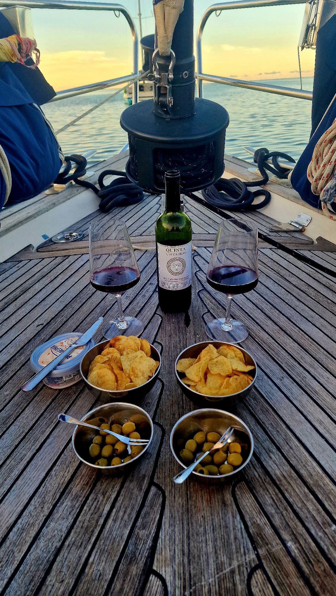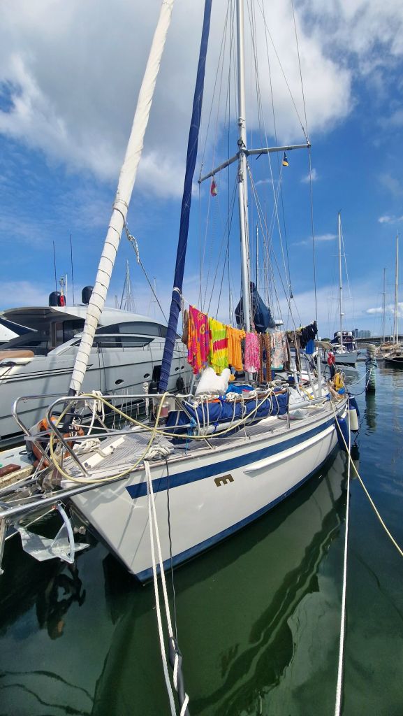 Första kvällen går vi på restaurangen på marinan. Det är så underbart att få maten serverad och att sitta vid ett bord och äta isf att ha tallriken i knät och försöka äta samtidigt som båten rullar och lutar. Nu hoppas vi att allt kommer gå smidigt, att reparationen går bra och att vi förhoppningsvis kan segla vidare om tre dagar igen.