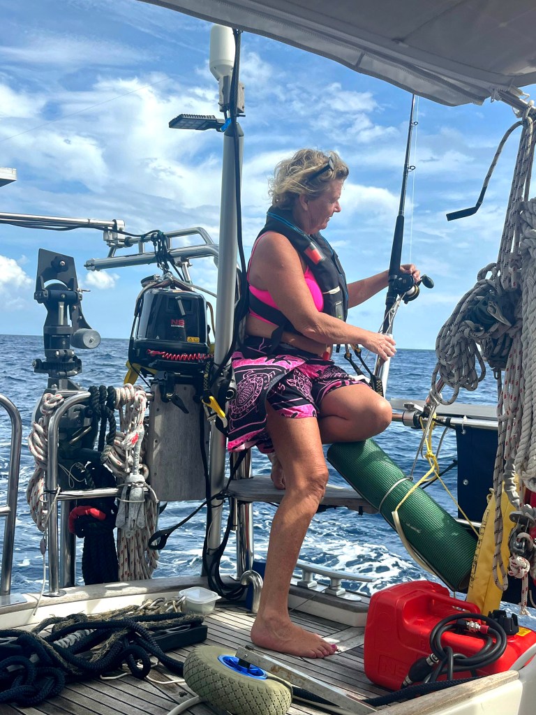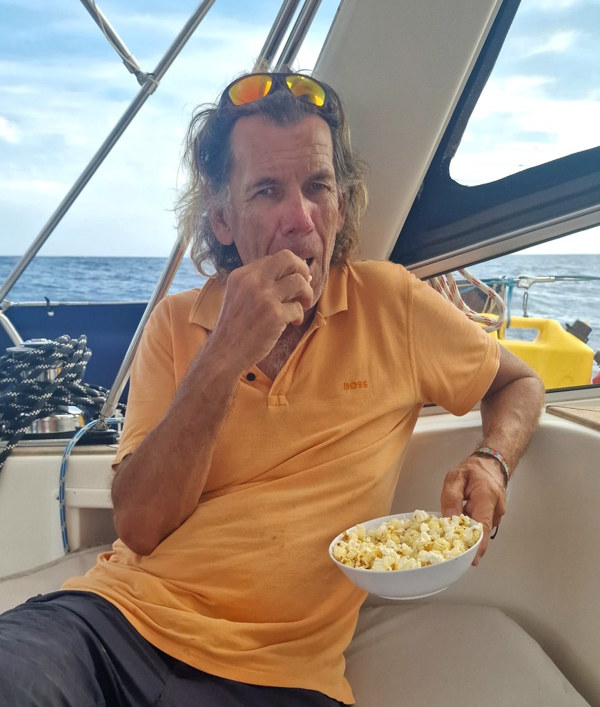 The evening turns to night and we go our shifts. After a few hours of motoring, we start sailing again. It’s blowing quite briskly and the boat tilts quite a bit so it’s hard to sleep. The day comes and both Jan and I feel tired and a little seasick. The sea bones have apparently completely disappeared. Maybe the extreme heat and all the preparations in the last few days are affecting it too. Neither of us has experienced seasickness before, so it’s something new that we’re happy to be aware of. Fortunately, none of us get really sick, it’s just a feeling in the body and a lack of appetite. When we wake up after going on duty and sleeping, we are both on our feet again. Full of new energy.