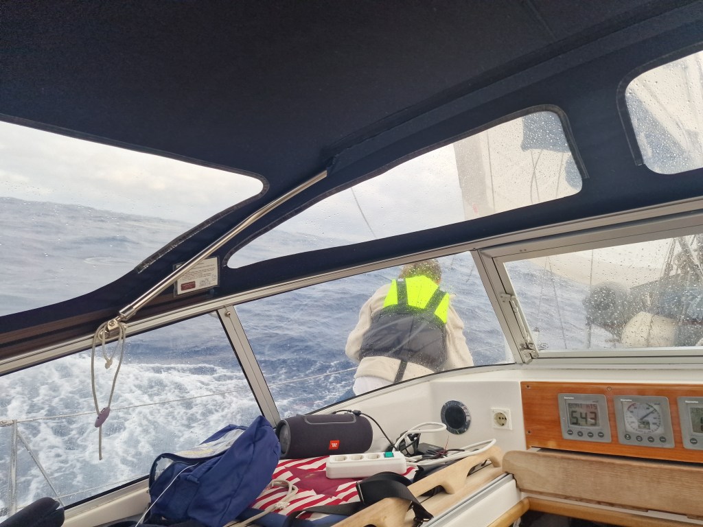 Ut på eftermiddagen blåser det upp mot 28 knop (ca 14 sekundmeter) i byarna och vi tangerade en hittills högsta fart på 11.8 knop i en surfvåg. Vågorna uppskattar vi till tidvis över 4 meter, kanske 5. Vi seglar med ett rev på storseglet och rullgenuan har bara en liten trekant utrullad – inte större än endast som några badlakan.