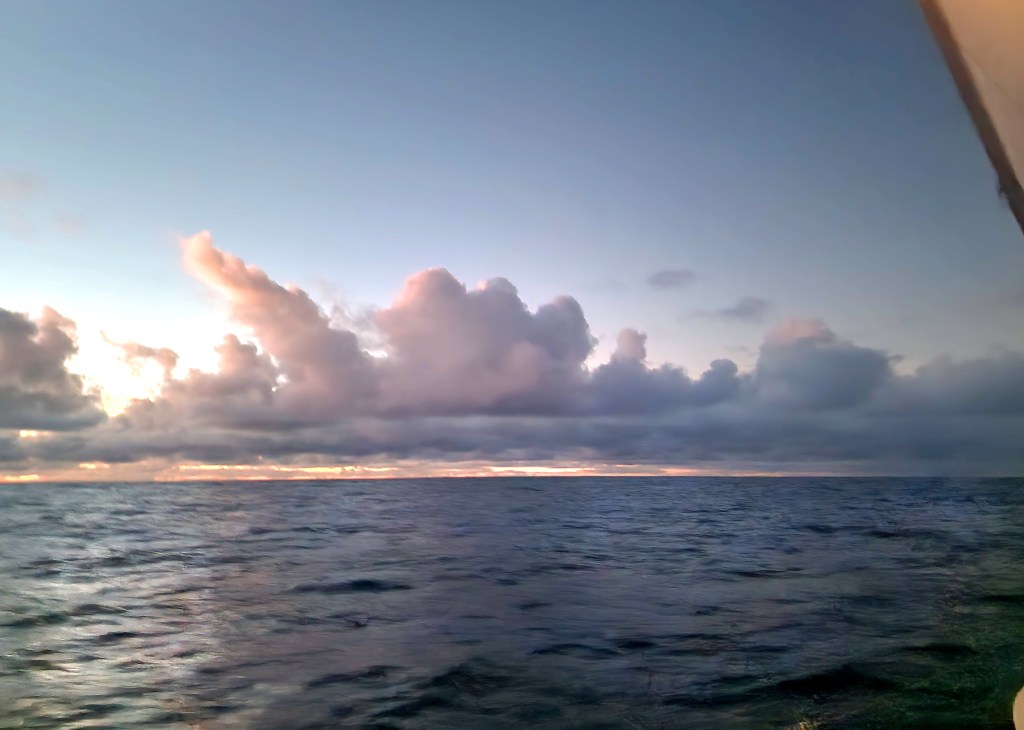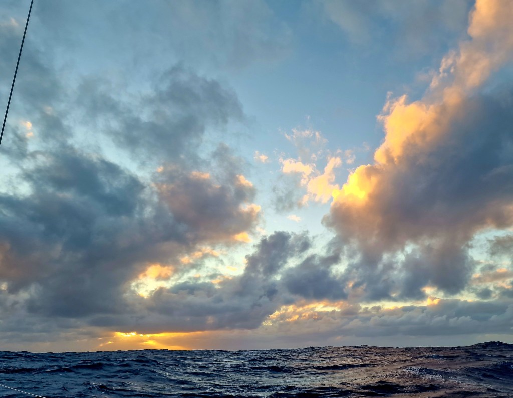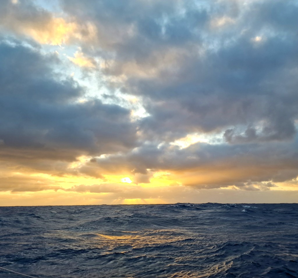 Sista två nätterna samt 5:e dagen fortsatte på samma sätt. Riktigt tuff och sjö med höga vågor och upp mot 17 sekundmeter. Båten kastades hit och dit och i vågdalarna kände vi oss pyttesmå. Fast varje morgon och kväll belönades vi av vacker gryning och skymning. Vi visste nu också att vi snart skulle nå vårat mål.