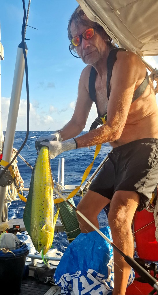 It doesn’t take long before we get a hold of our fishing line. There was a small fight, but the fish, a yellowfin tuna, is not very big, so it soon gives up and follows along, splashing on the surface of the water. There will be at least two fantastically good dinners. Probably grilled tuna with a lot of garlic and maybe cilantro.⁸