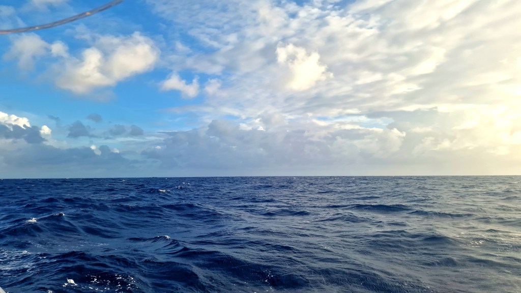 The second day of sailing flowed by in a continued pleasant sailing. Cloudier and more varied wind strength. The hours passed and soon it was evening again. Just before midnight it started to rain a little bit but very quickly it turned into a downpour and the wind suddenly rose to eighteen meters per second. A squall had come over us. Quickly in with most of the furling jib and we had to steer the boat by hand. The autopilot couldn’t cope with the gusts so it let go of the course we programmed. Everything was over in a couple of minutes and then it was calm and quiet again. The wind returned to about five to seven meters per second and we surfed forward in the lovely veil we had the whole time. During the night it looked like more squalls were coming but none that came over us.
