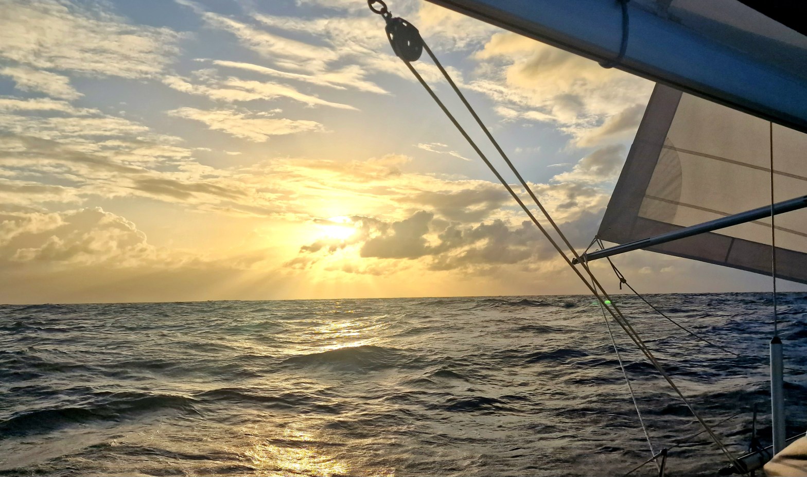 Denna första kväll på andra etappen seglar vi in i solnedgången som är rakt framför fören av vår båt. Lika magiskt som alltid med dessa solnedgångar och färgspelet på himmelen.