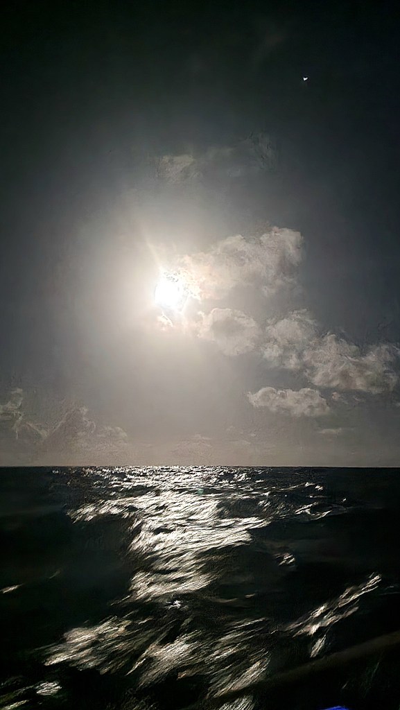 Vi seglar sedan in i mörkret. Det näst intill kompakta mörkret. Ännu fyra timmar efter solnedgången har månen inte dykt upp på himmelen. Det är så mörkt att det knappt går att se handen framför sig. En trollbindande känsla och känslan av att vara ett med havet och mörkret infinner sig. Det är fullt av stjärnor som formar sig till alla stjärntecken. Tänk att man förr navigerar efter stjärnorna ute på de stora haven. En kunskap inte många besitter idag.