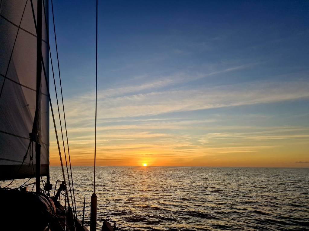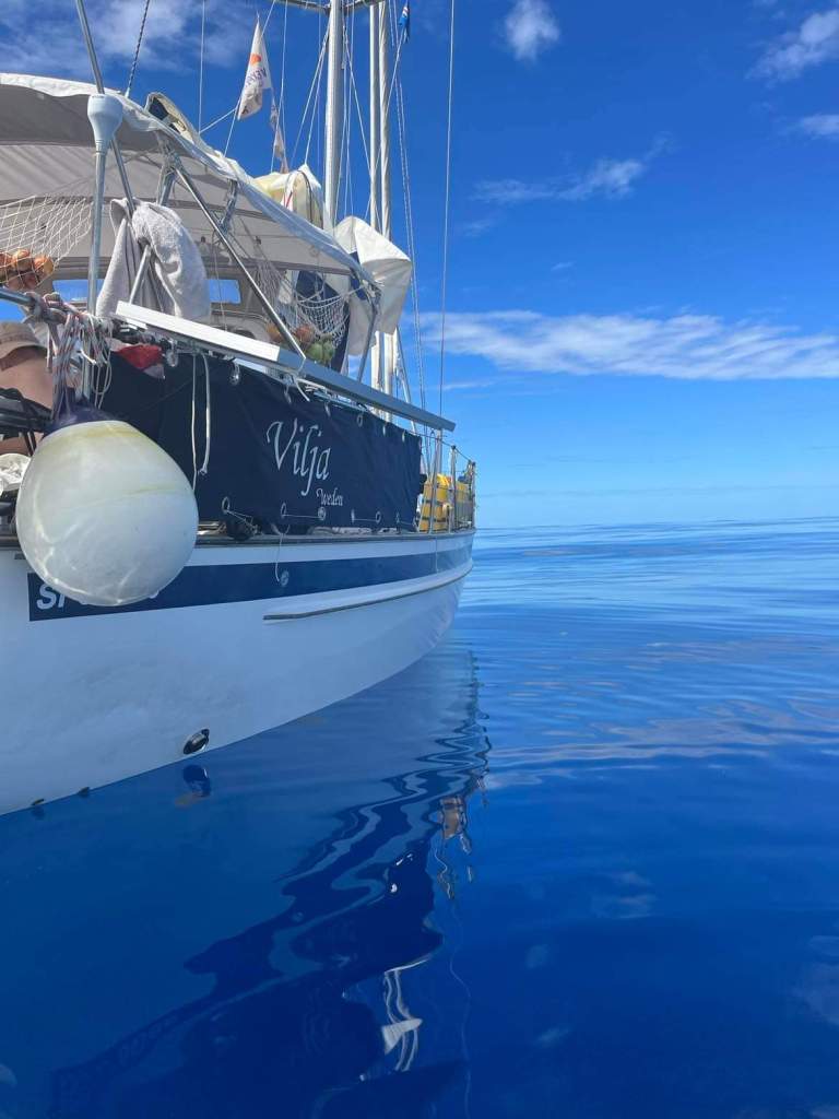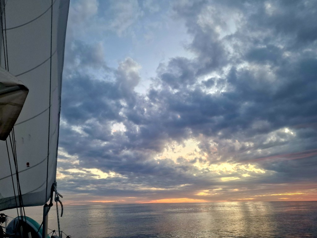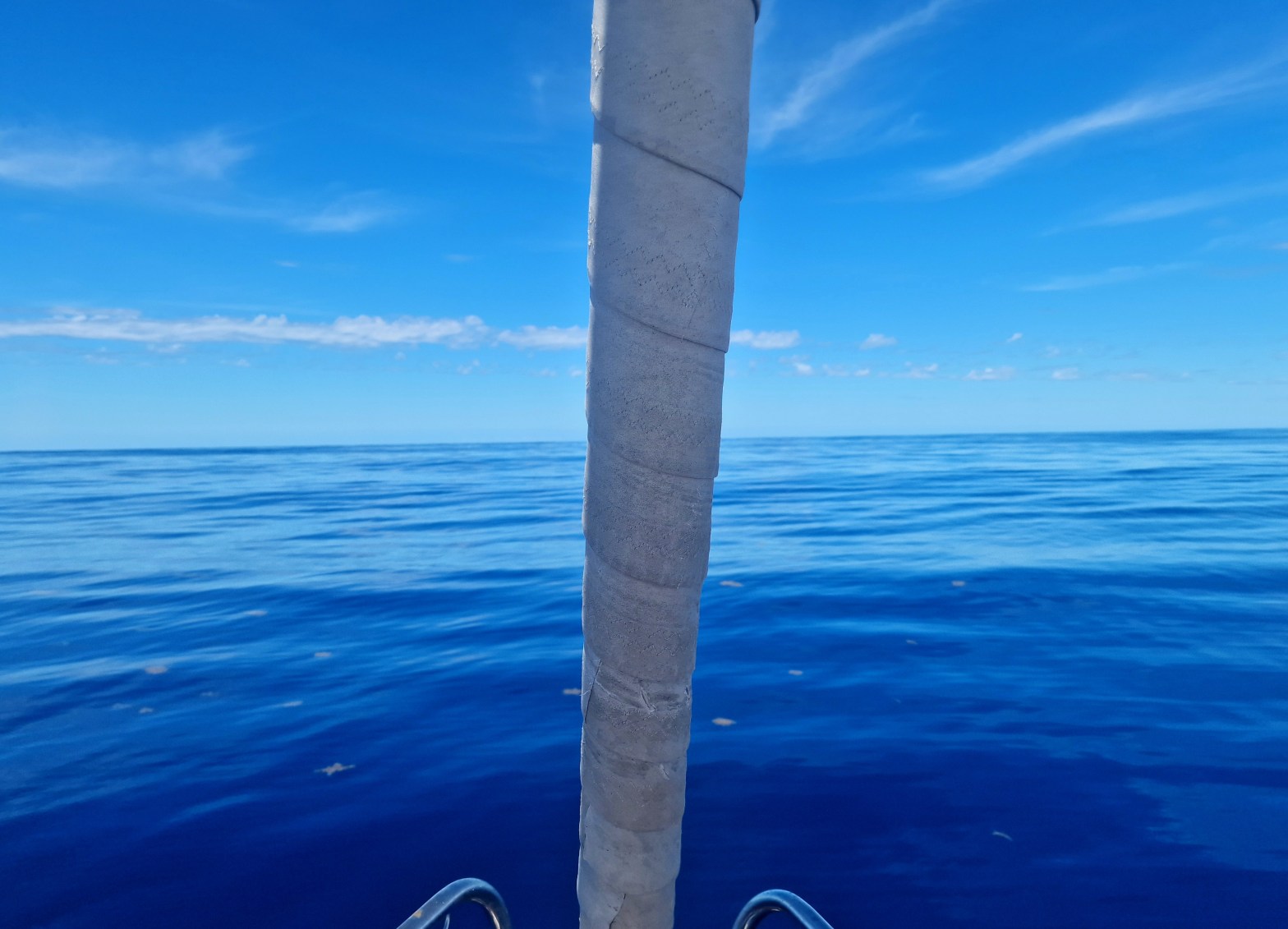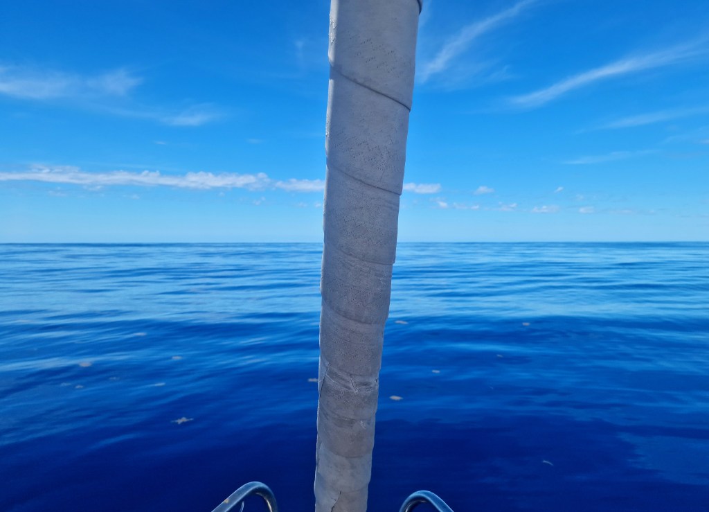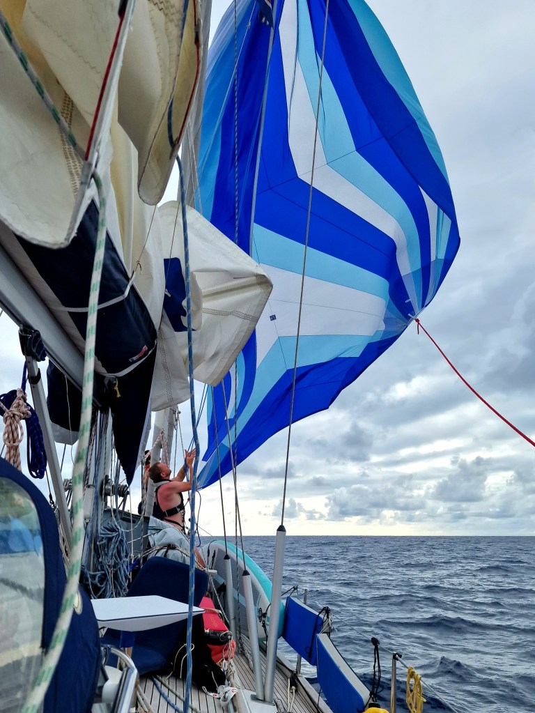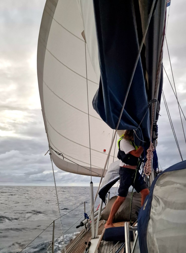 Det är svårt att få seglen att bli nöjda idag. Vinden är ganska svag och vågorna gör att vi rullar mycket. Vi provar att spira genuan, vilket betyder att man tvingar ut genuan på motsatt sida med en extra bom, men det fungerar inte. Det behövs två uppe på däck för att få till det. Vinden är rakt akterifrån så det är plattläns. Vilket betyder att genuan inte får så mycket vind utan storseglet tar den lilla vind som är. Eftersom vi rullar så mycket vrider vinden ibland in lite från styrbord och ibland lite från babord så seglen slår obehagligt och det sliter på dem.