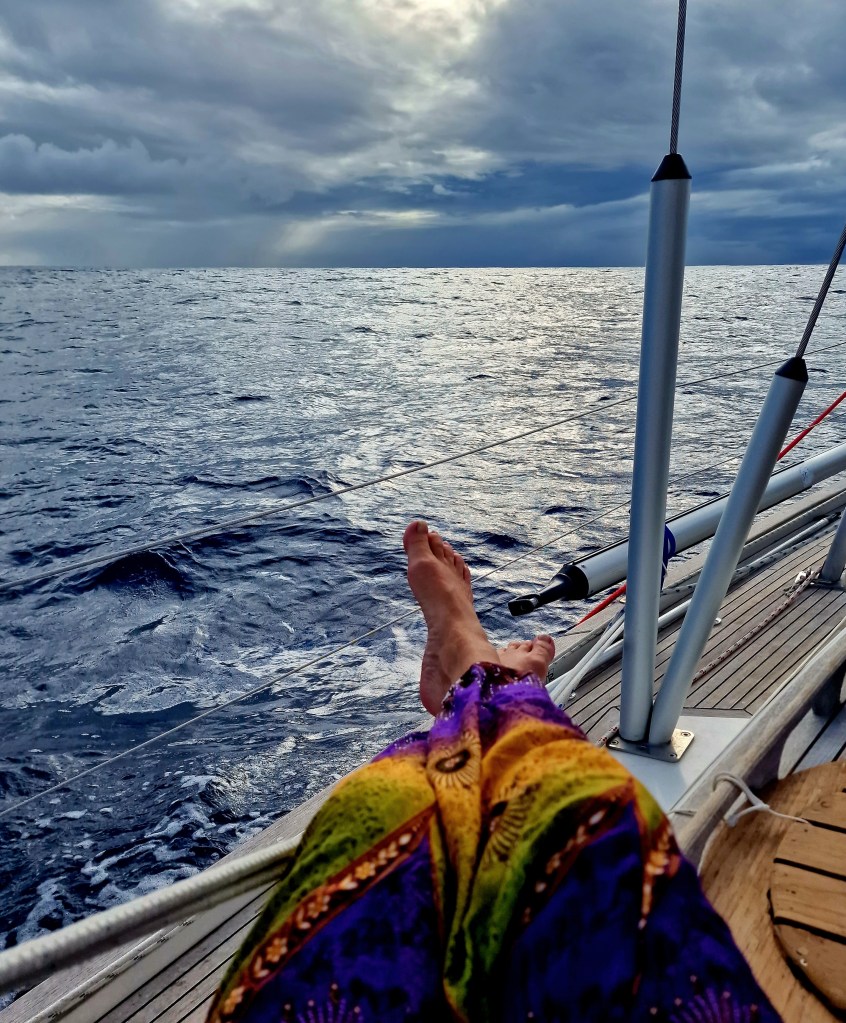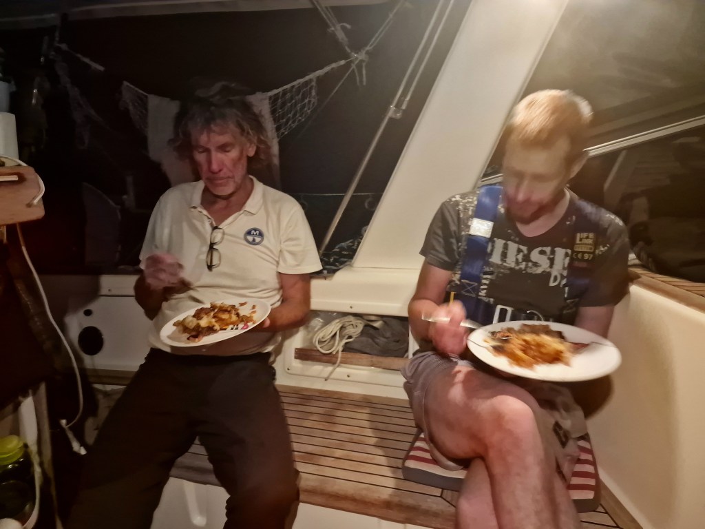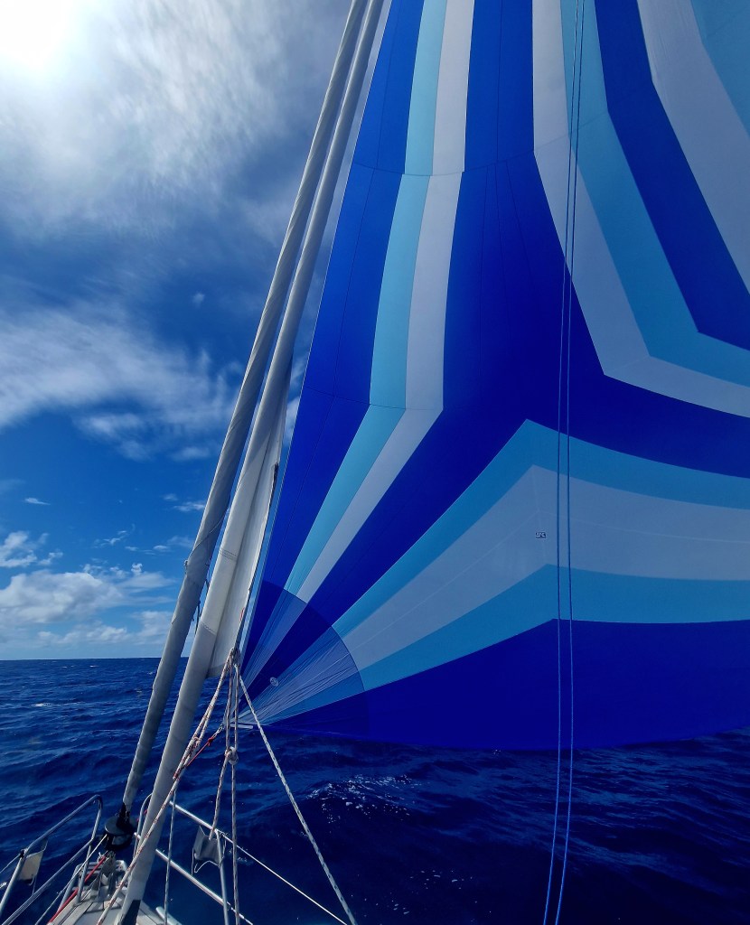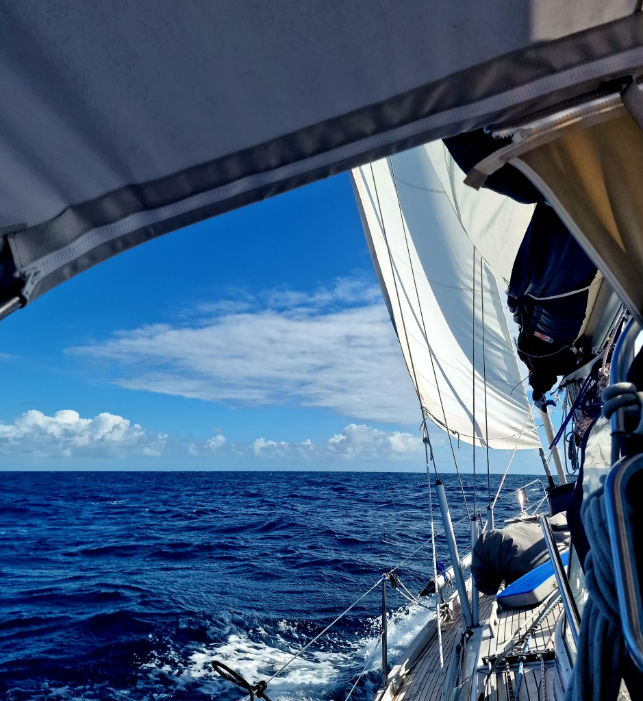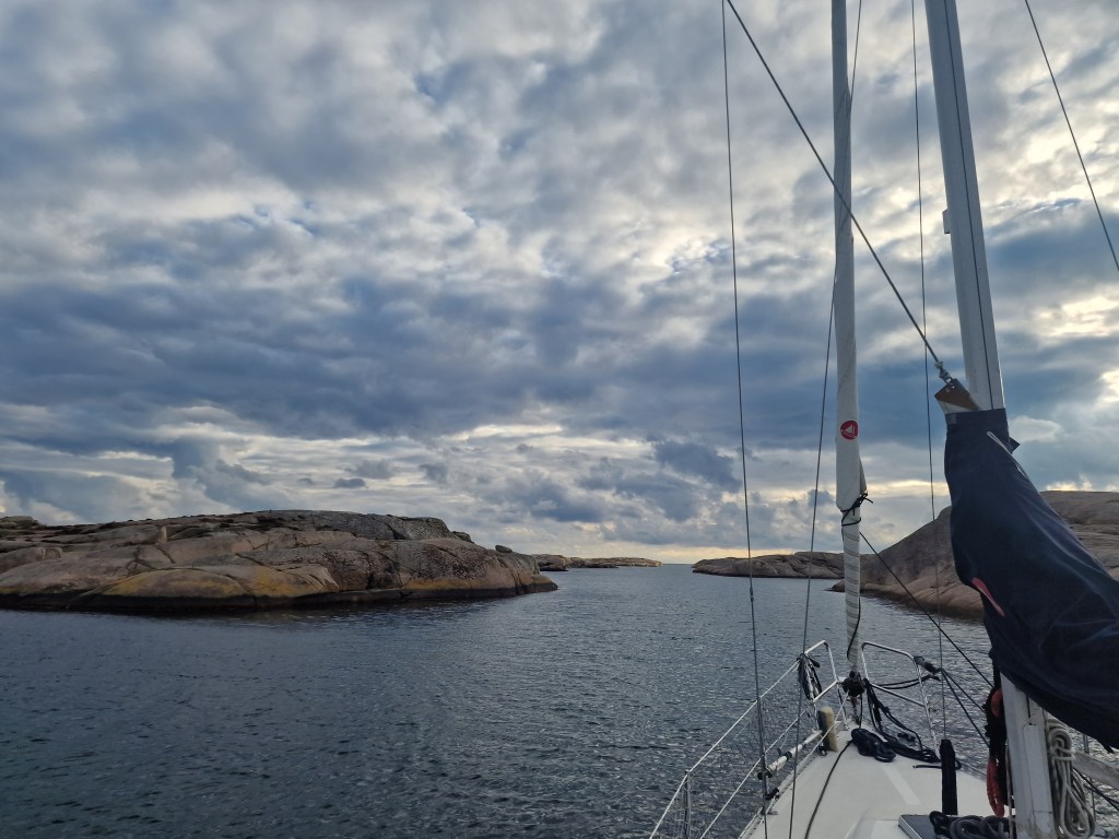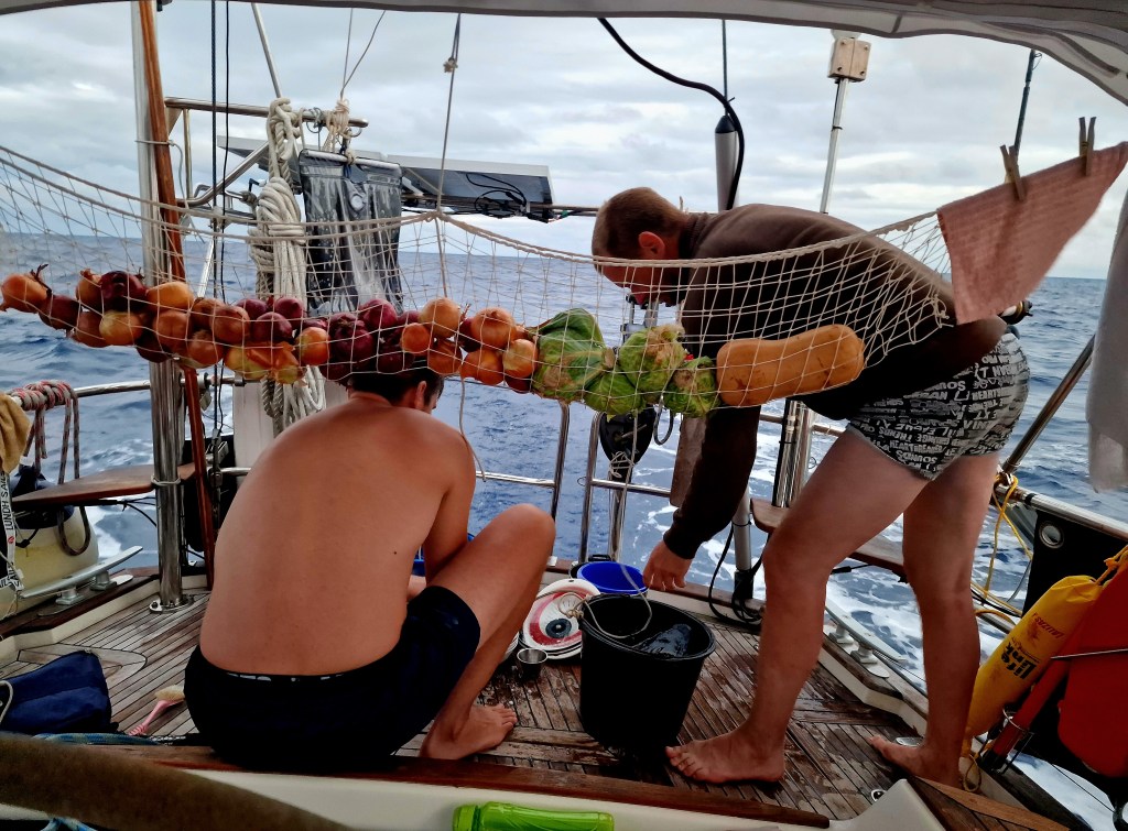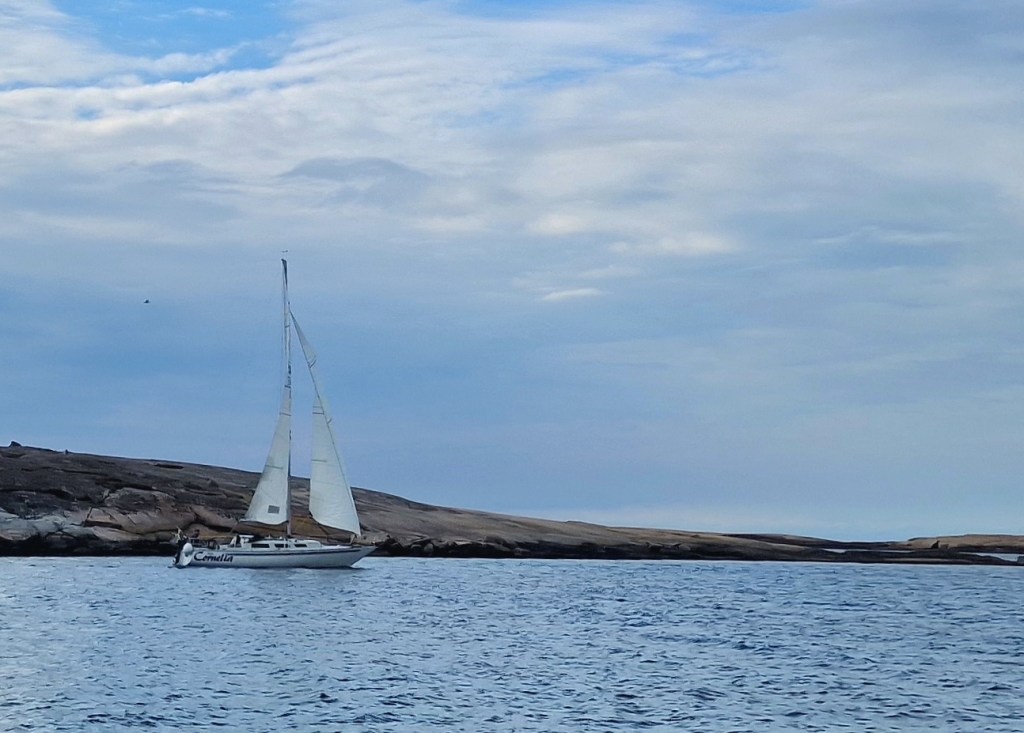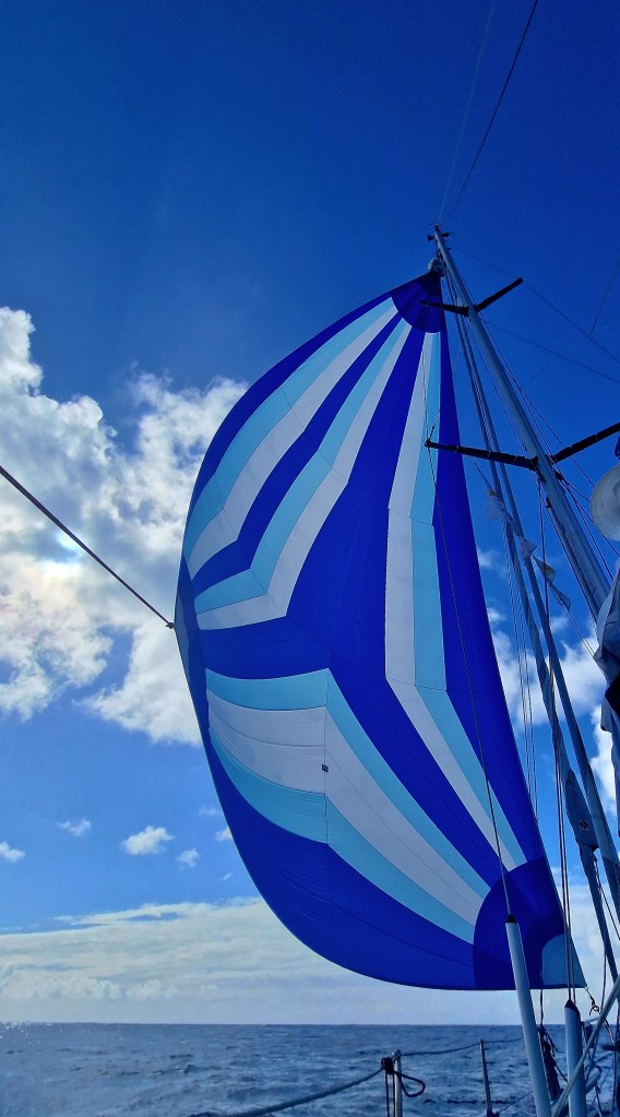 Det är svårt att få seglen att bli nöjda idag. Vinden är ganska svag och vågorna gör att vi rullar mycket. Vi provar att spira genuan, vilket betyder att man tvingar ut genuan på motsatt sida med en extra bom, men det fungerar inte. Det behövs två uppe på däck för att få till det. Vinden är rakt akterifrån så det är plattläns. Vilket betyder att genuan inte får så mycket vind utan storseglet tar den lilla vind som är. Eftersom vi rullar så mycket vrider vinden ibland in lite från styrbord och ibland lite från babord så seglen slår obehagligt och det sliter på dem.