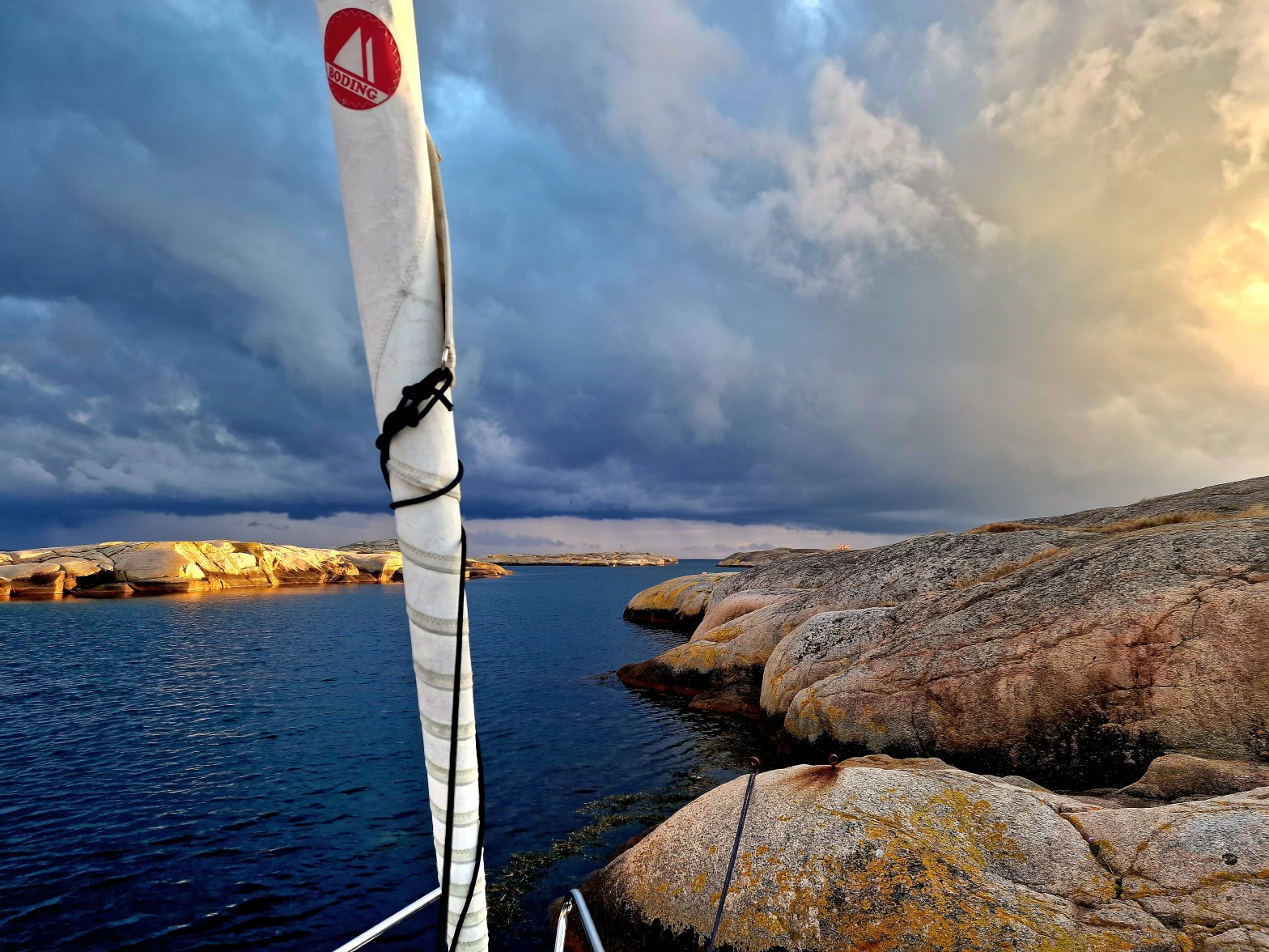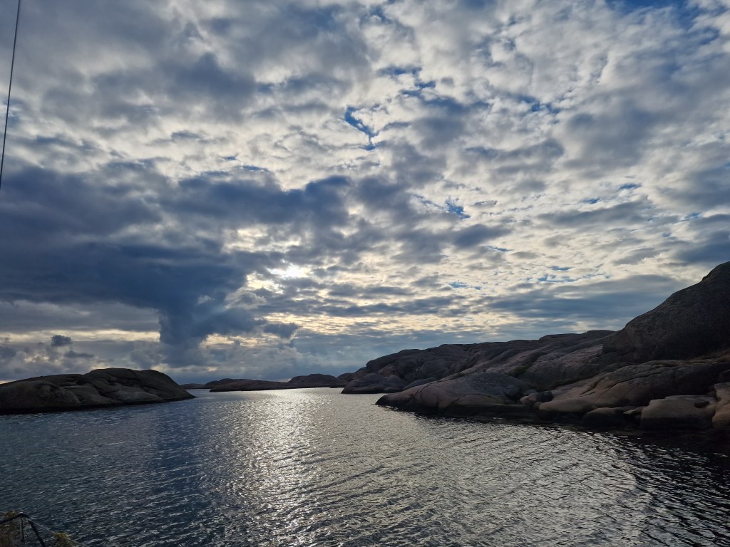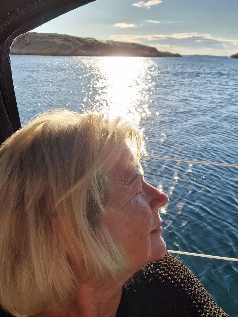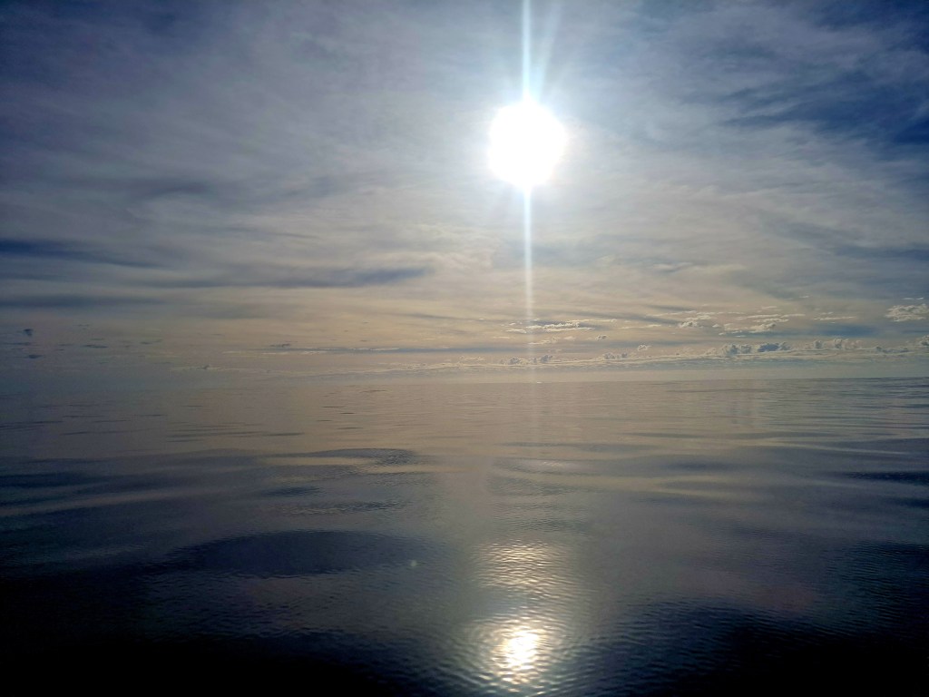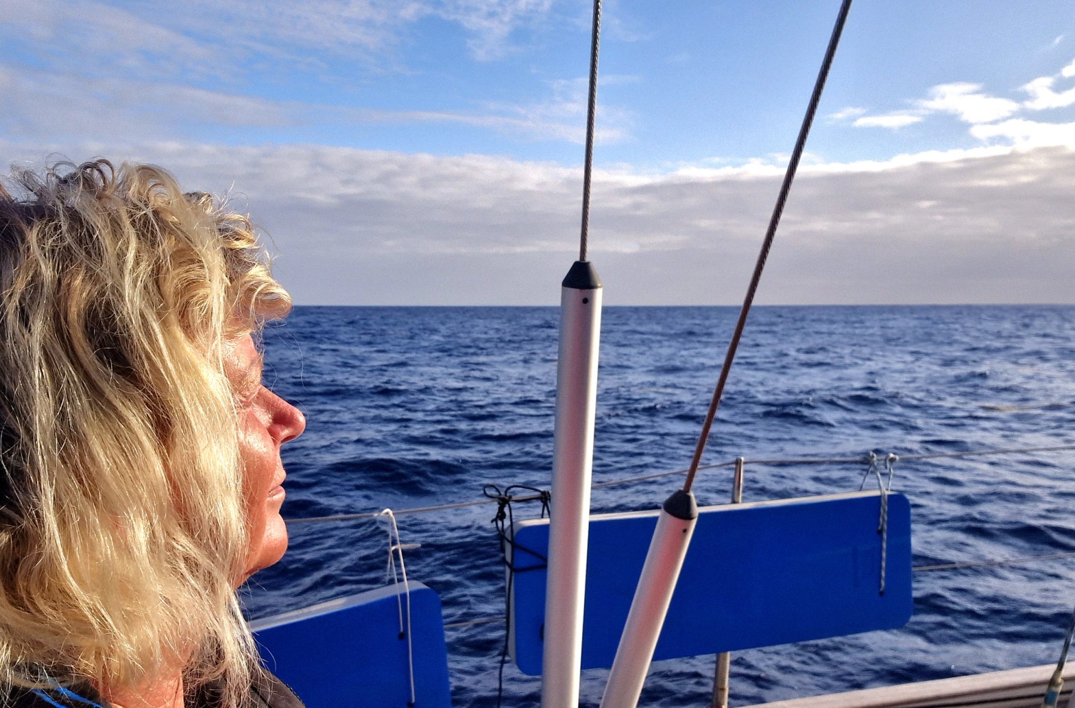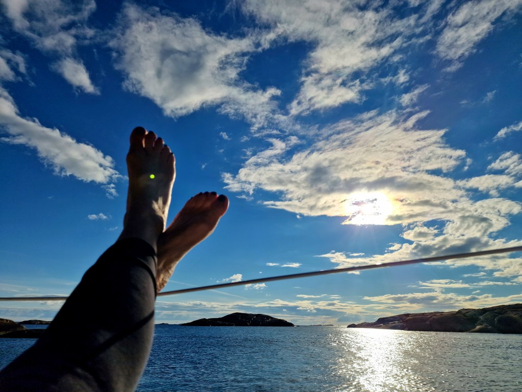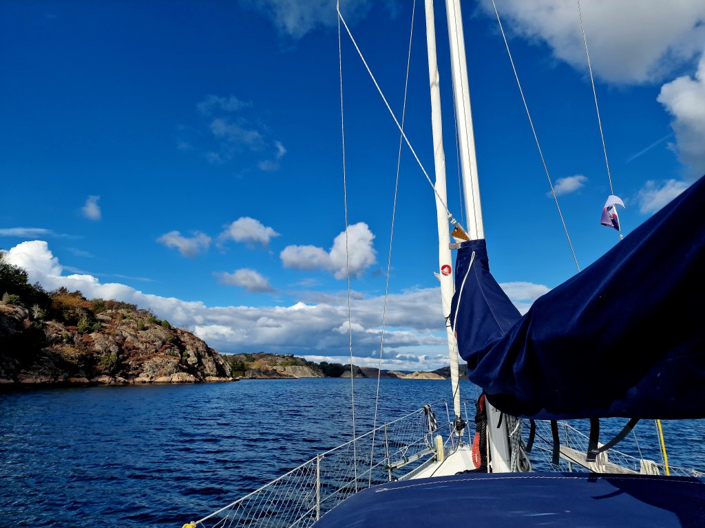 Det är svårt att få seglen att bli nöjda idag. Vinden är ganska svag och vågorna gör att vi rullar mycket. Vi provar att spira genuan, vilket betyder att man tvingar ut genuan på motsatt sida med en extra bom, men det fungerar inte. Det behövs två uppe på däck för att få till det. Vinden är rakt akterifrån så det är plattläns. Vilket betyder att genuan inte får så mycket vind utan storseglet tar den lilla vind som är. Eftersom vi rullar så mycket vrider vinden ibland in lite från styrbord och ibland lite från babord så seglen slår obehagligt och det sliter på dem.