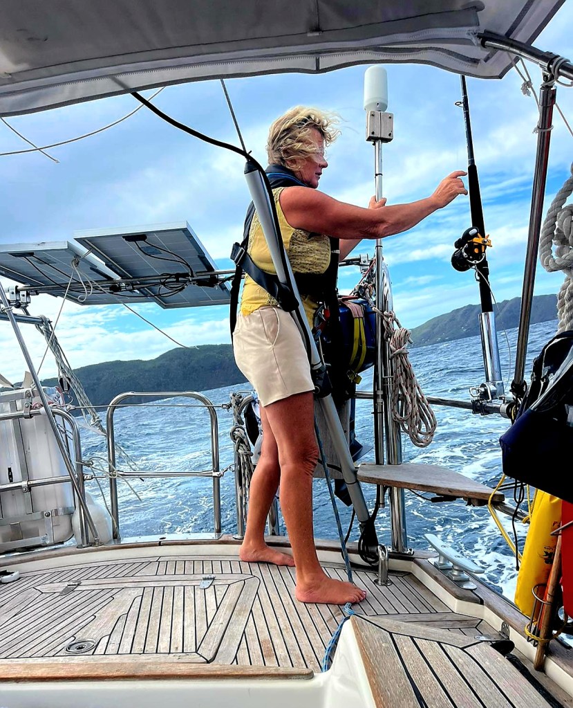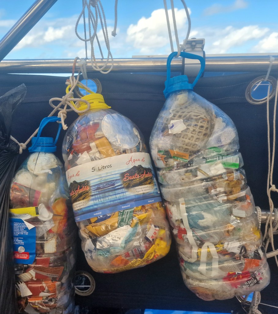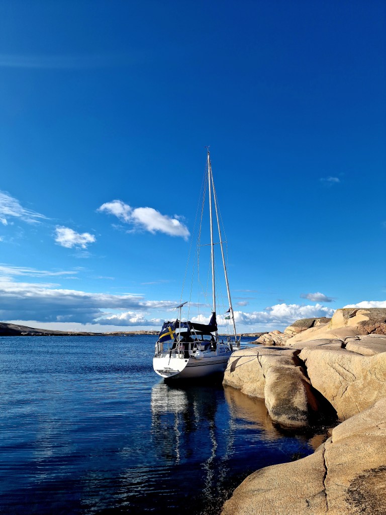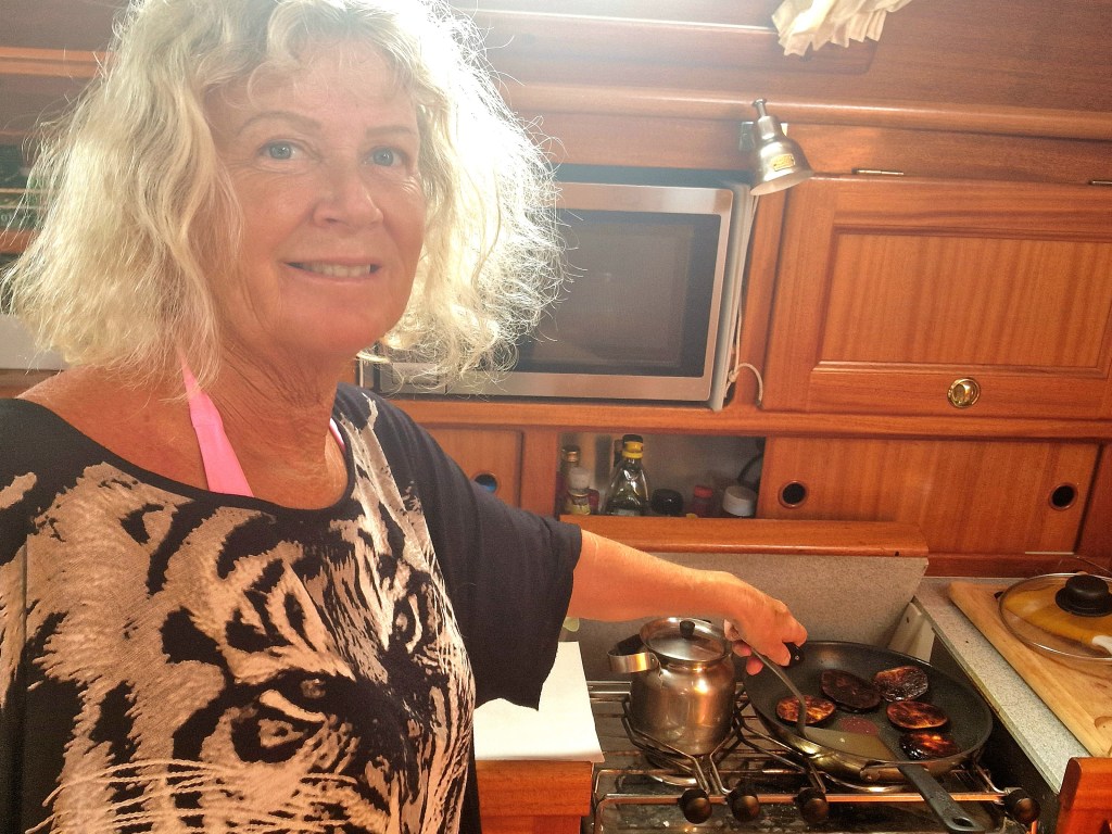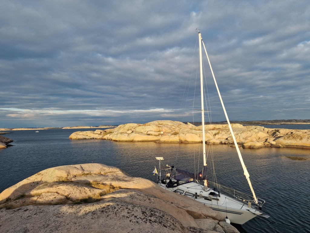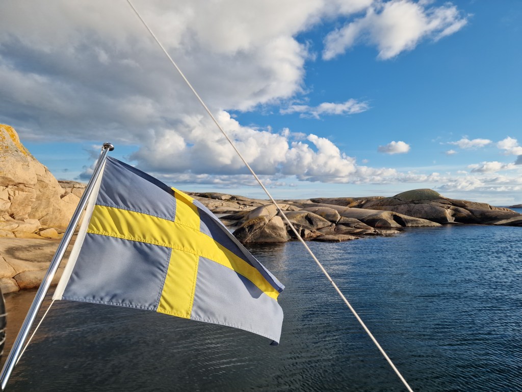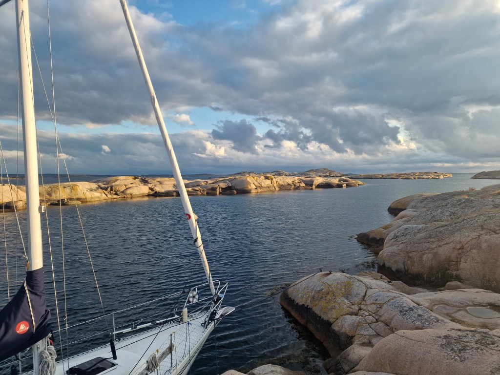 Det är svårt att få seglen att bli nöjda idag. Vinden är ganska svag och vågorna gör att vi rullar mycket. Vi provar att spira genuan, vilket betyder att man tvingar ut genuan på motsatt sida med en extra bom, men det fungerar inte. Det behövs två uppe på däck för att få till det. Vinden är rakt akterifrån så det är plattläns. Vilket betyder att genuan inte får så mycket vind utan storseglet tar den lilla vind som är. Eftersom vi rullar så mycket vrider vinden ibland in lite från styrbord och ibland lite från babord så seglen slår obehagligt och det sliter på dem.
