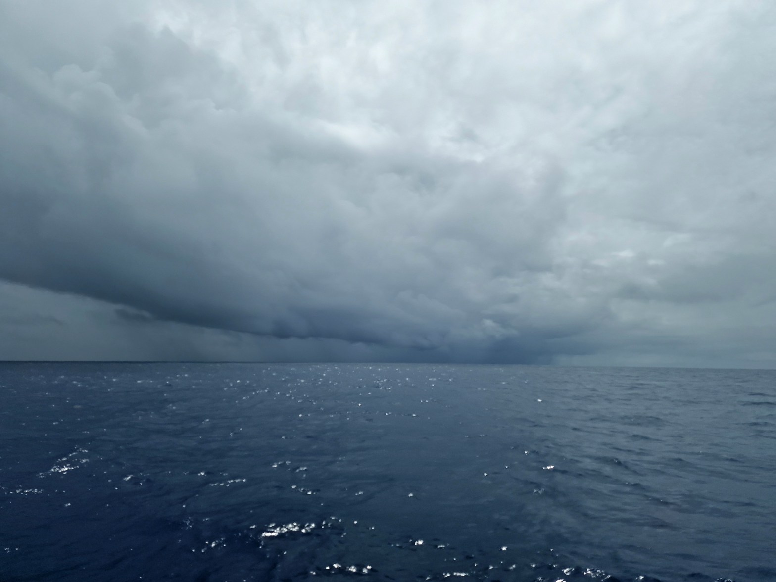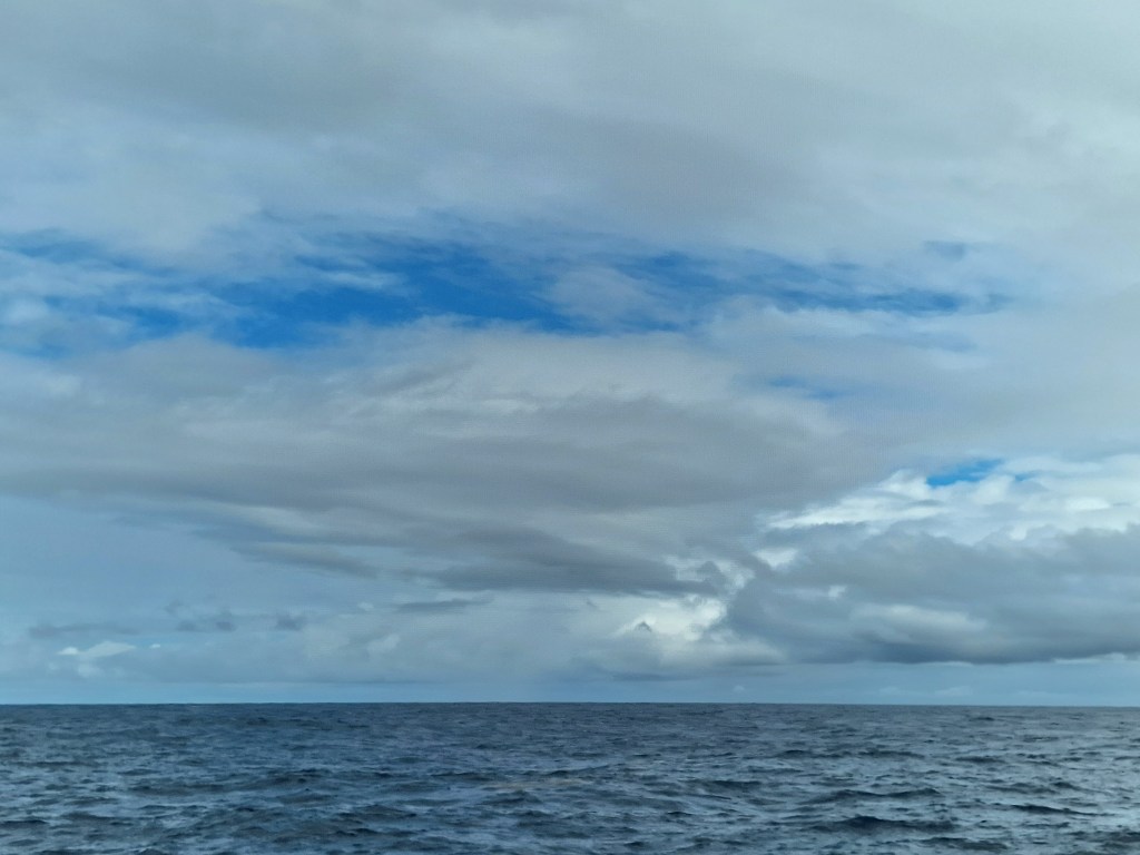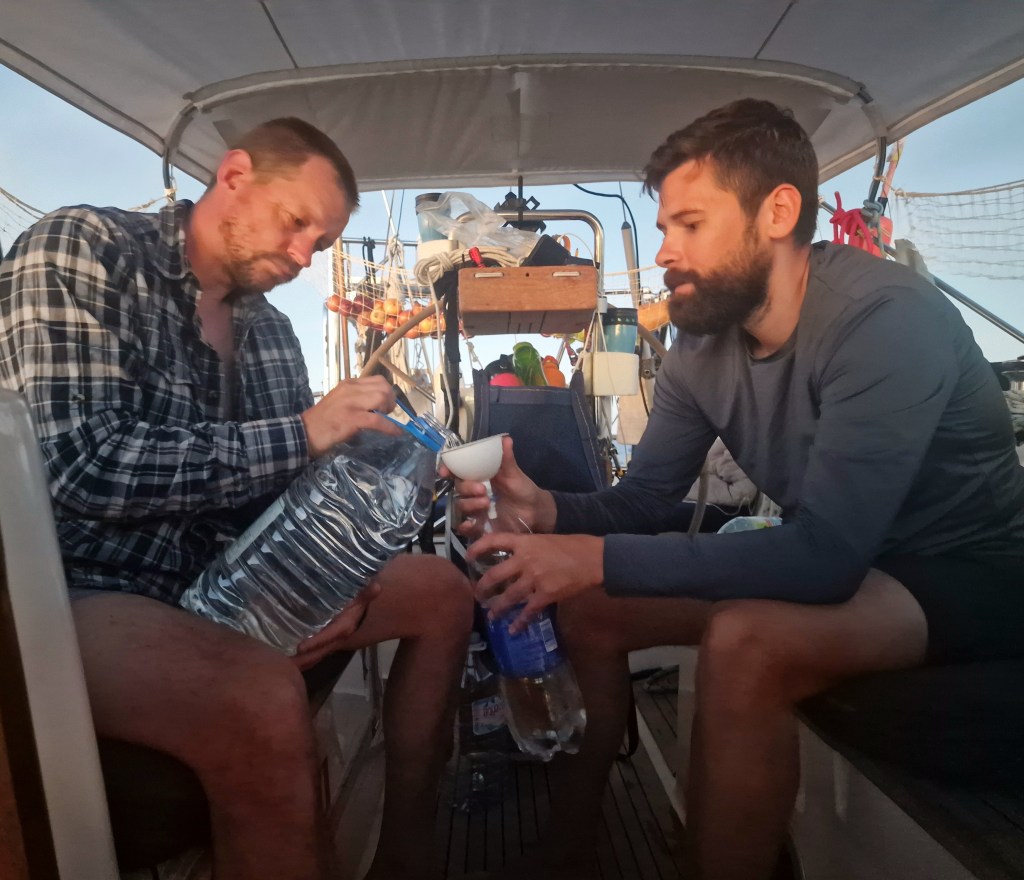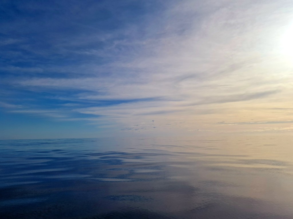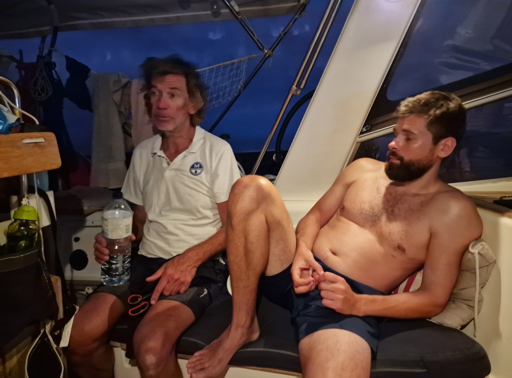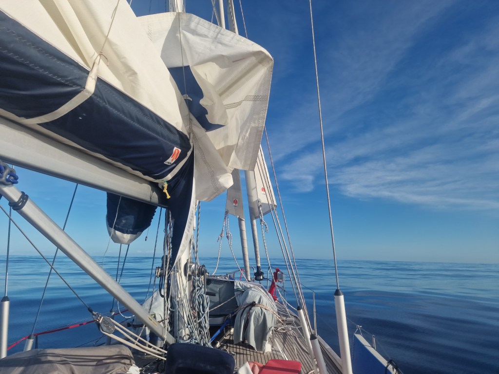 It’s hard to get the sails to be happy today. The wind is quite light and the waves are causing us to roll a lot. We’re trying to furl the genoa, which means forcing the genoa out to the opposite side with an extra boom, but it doesn’t work. You need two people on deck to do it. The wind is straight from the stern so it’s flat. Which means the genoa doesn’t get much wind, but the mainsail takes what little wind there is. Because we’re rolling so much, the wind sometimes turns in a little from starboard and sometimes a little from port so the sails hit uncomfortably and it wears them out.