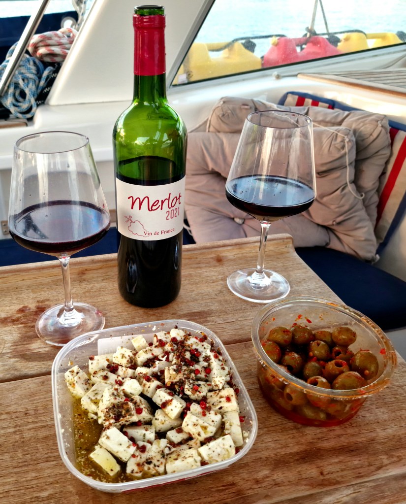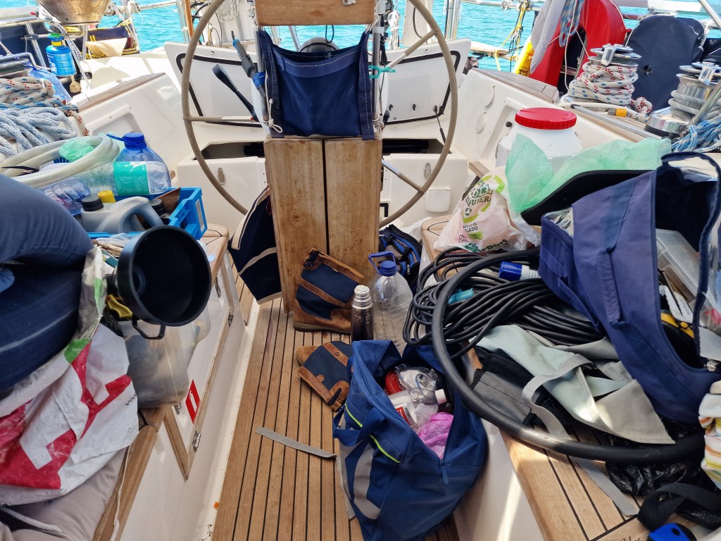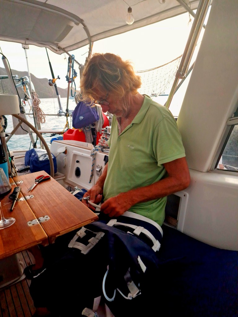 It’s hard to get the sails to be happy today. The wind is quite light and the waves are causing us to roll a lot. We’re trying to furl the genoa, which means forcing the genoa out to the opposite side with an extra boom, but it doesn’t work. You need two people on deck to do it. The wind is straight from the stern so it’s flat. Which means the genoa doesn’t get much wind, but the mainsail takes what little wind there is. Because we’re rolling so much, the wind sometimes turns in a little from starboard and sometimes a little from port so the sails hit uncomfortably and it wears them out.