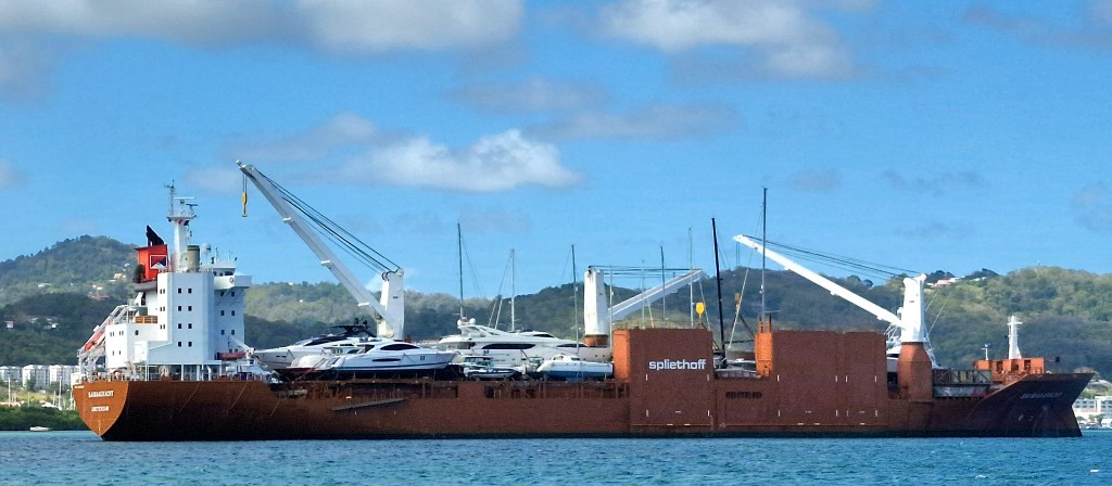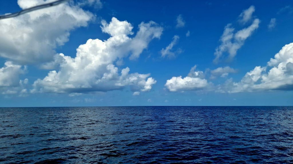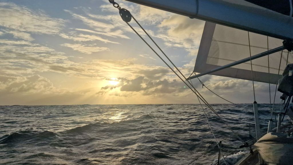 Det är svårt att få seglen att bli nöjda idag. Vinden är ganska svag och vågorna gör att vi rullar mycket. Vi provar att spira genuan, vilket betyder att man tvingar ut genuan på motsatt sida med en extra bom, men det fungerar inte. Det behövs två uppe på däck för att få till det. Vinden är rakt akterifrån så det är plattläns. Vilket betyder att genuan inte får så mycket vind utan storseglet tar den lilla vind som är. Eftersom vi rullar så mycket vrider vinden ibland in lite från styrbord och ibland lite från babord så seglen slår obehagligt och det sliter på dem.