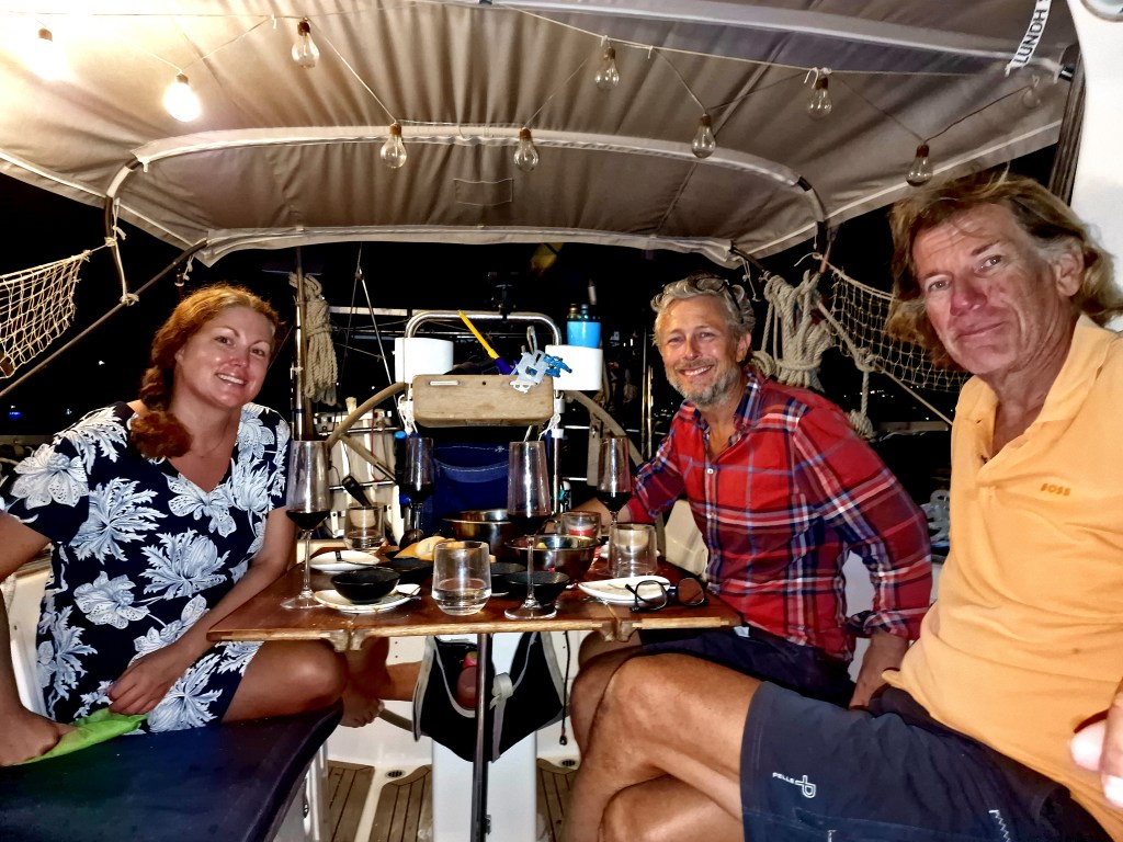Som tack för att segelbåtar hjälper dem är de otroligt vänliga. Idag när vi kommer dit bjuder de in oss till middag. Det är en magisk kväll. Vi är 10 personer som spänt kommer in och hälsar på familjen. De är mitt uppe i matlagningen. Kokoskrabborna står och kokar i en kastrull med kokosmjölk och curry över öppen eld. Den nyfångad fisken skärs i småbitar och förvandlas med grönsaker och lime till en vacker ceviche. Den lilla pojken tycker det är spännande med nya folk som ger honom uppmärksamhet. Måste vara tråkigt att aldrig ha några vänner men han lever ändå ett behagligt liv. Vi sätter oss till bords och blir serverade en fantastiskt välsmakande måltid. Tänk att vi sitter här mitt ute i Stilla Havet och får äta kokoskrabba och ceviche! Familjen vill inte ha betalt för maten men de önskar att vi tar med mat och/eller praktiska saker till dem. Det är enda sättet de kan få mat till sig. Med seglare som kommer hit. De får både frukt, grönsaker, konserver, pasta och en massa andra saker som vi hoppas de får glädje av. Kvällen är jättelyckad och vi åker tillbaka med våra jollar mätta och belåtna och med mungiporna upp till öronen efter en magisk upplevelse.